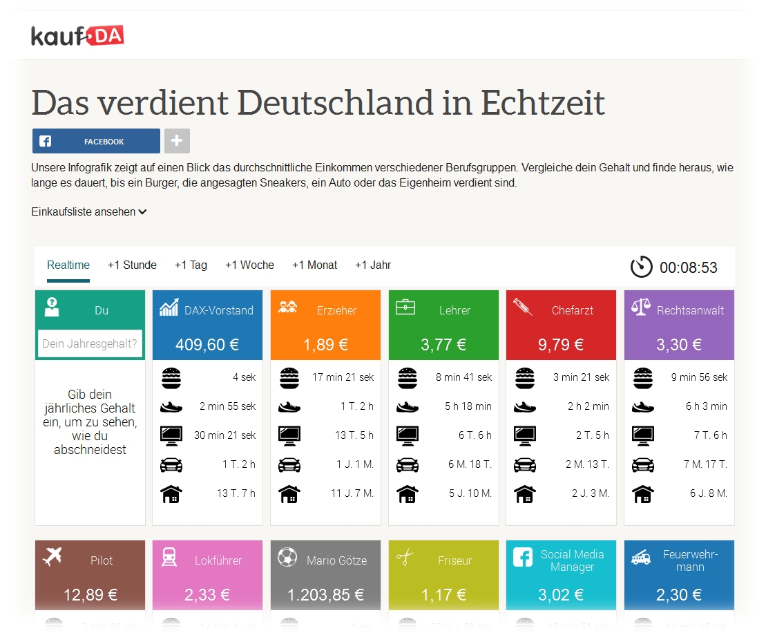Wie viel verdient eigentlich so ein „Social Media Manager“? Und wie viel verdient er so im Vergleich mit „Mario Götze“ oder besser noch, im Vergleich mit anderen Berufsgruppen? Götze kann sich alle zehn Minuten einen „4K Ultra HD TV“-Fernseher kaufen. Sein Der Friseur braucht dafür einen Monat, mal ganz abgesehen von allen anderen Ausgaben, die man tätigen muss, um gut Leben zu können. kaufDA hat eine neue Infografik „Das verdient Deutschland in Echtzeit“ erstellt und bietet Gehalts-Vergleiche für verschiedene Berufsgruppen. Dax-Vorstand wäre schon nicht schlecht, was? Wer sich selber mit den anderen Berufsgruppen vergleichen möchte, kann hierbei auch sein eigenes Gehalt eingeben → www.kaufda.de/info/so-viel-verdient-deutschland/