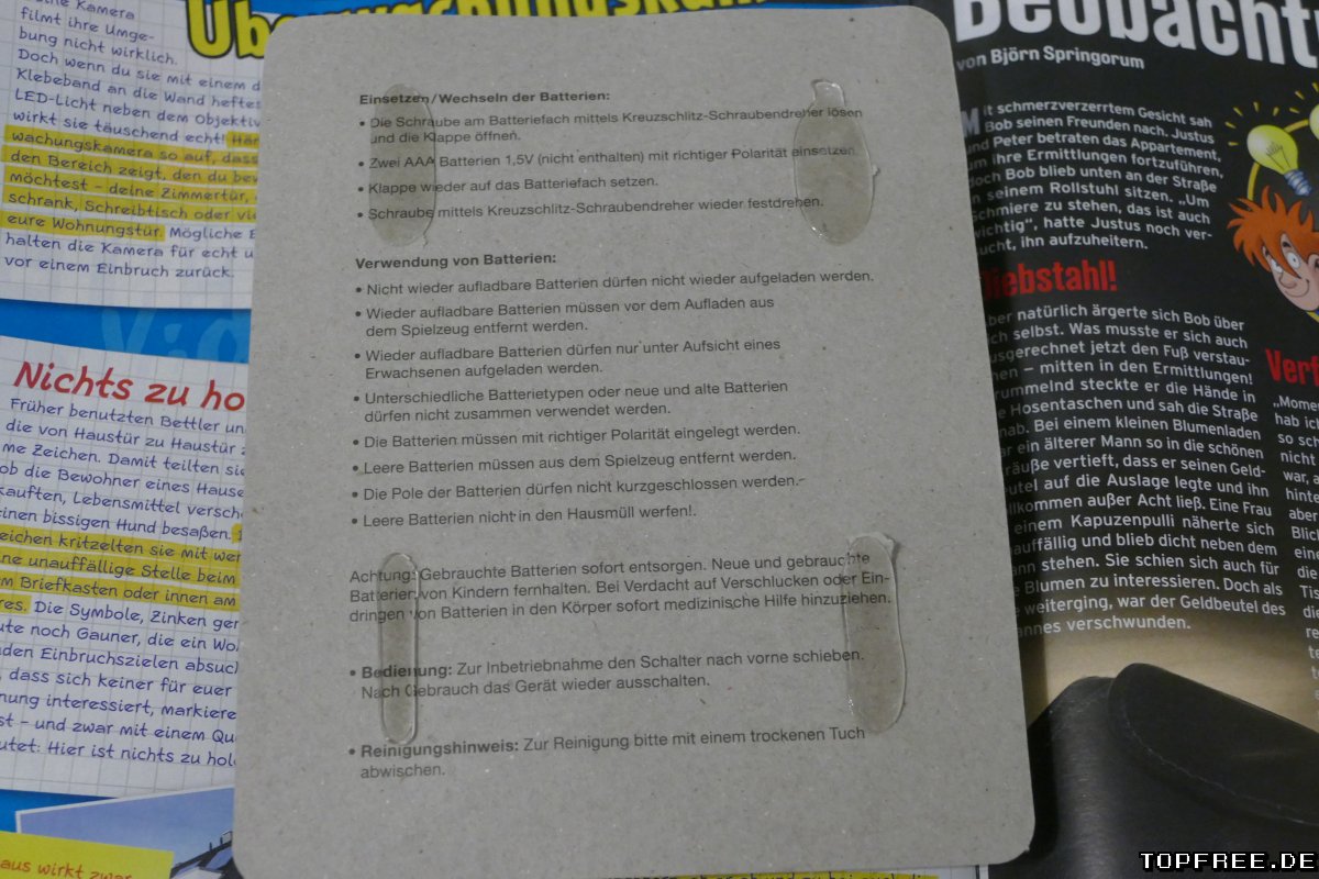 Fans des Kinofilms wird das Magazin in der Auslage direkt ins Auge springen. Allen anderen vielleicht eher das beiliegende Gimmick: Eine Überwachungskamera zur Abschreckung als Extra. Das besteht zwar nur aus billigem Plastik und benötigt zwei AAA-Batterien. Könnte aber in einem kleinen Zimmer oder Kellerraum von weiter weg abschreckend wirken. Nur zu nahe sollte der potentielle Übeltäter nicht an das Plastikteil herankommen. Denn es ist offensichtlich, dass es sich dabei um eine Attrappe handelt. Dennoch: Ich habe es mal aufgestellt und hoffe, dass es außer mir sonst niemand entdeckt – oder eben doch abschreckend wirkt (die rote Lampe leuchtet durchgehend blinkend, wenn eingeschaltet). Etwas ungünstig ist mal wieder die Beklebung auf dem Heft. Nur ganz vorsichtig abgezogen, bleibt das Cover danach gut erhalten. Ansonsten könnte ein Stück vom Heft am Kleber hängen bleiben.