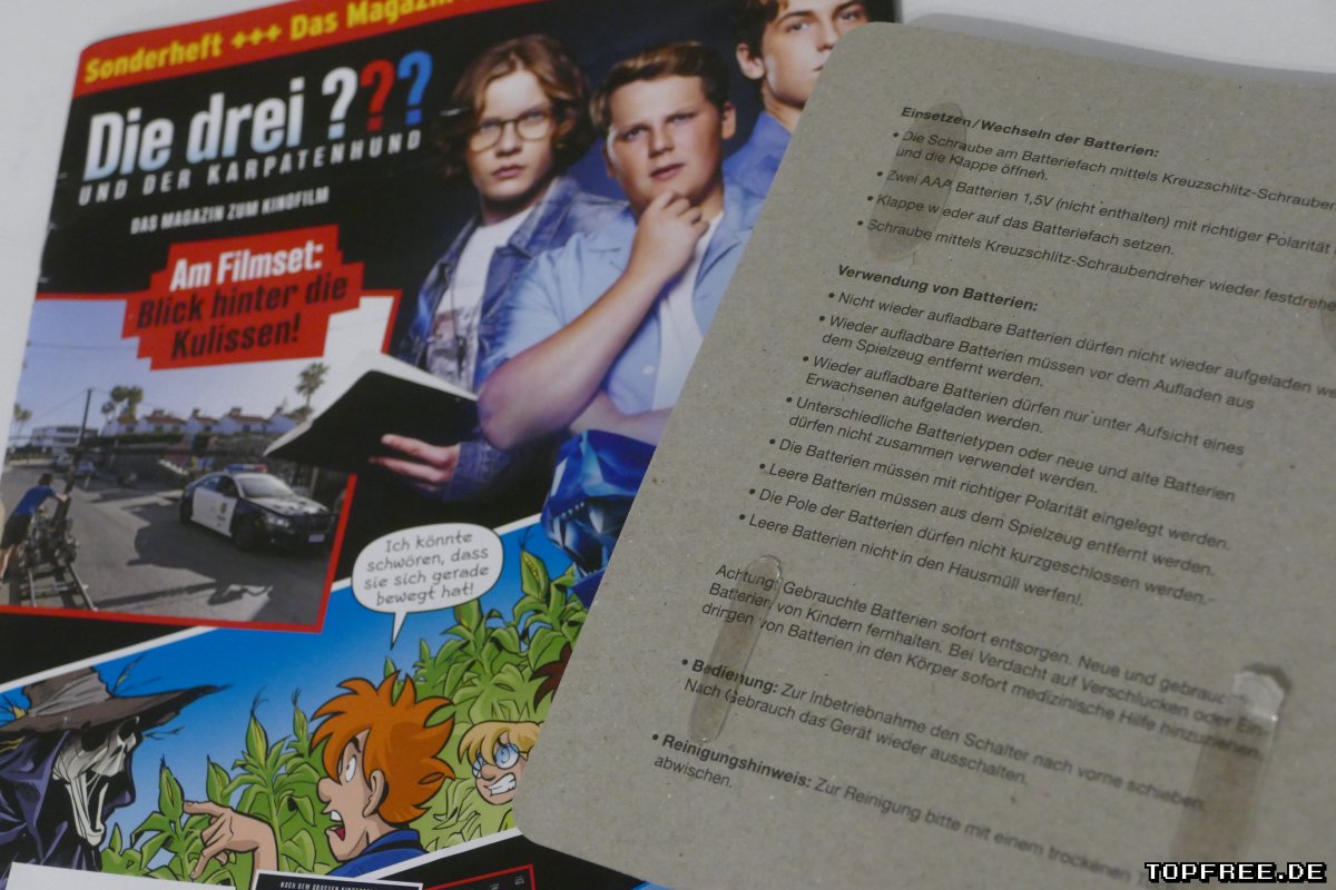 Die drei ??? und der Karpatenhund – Das Magazin zum Kinofilm bietet einen kurzen Lesespaß für die jüngere Generation. Die Rätsel sind sehr einfach gehalten. Schön dabei ist jedoch, dass der Comic nicht einfach nur ein Comic ist, sondern ebenfalls mit Rätseln versehen wurde. Wer den Kinofilm aber nicht sieht, der bekommt wiederum ein offenes Ende des Comics und bleibt etwas unbefriedigt nach dem Lesen zurück. Tatsächlich kenne ich den Film nicht und habe das Heft unabhängig davon gekauft. Braucht man es denn? Fans der drei Fragezeichen bietet das Magazin leider nur sehr wenig Hintergrundinformationen. Es ist ein Mix aus Werbung zum Film und eben nur einer Seite mit Bildern hinter den Kulissen. Das Gimmick ist eher ein Gag, könnte aber tatsächlich als Überwachungskamera-Attrappe eingesetzt werden. Ob’s letztendlich etwas bringen würde? Keine Ahnung. Für 5,99 Euro ist das Heft auf jeden Fall ein bisschen dünn.
