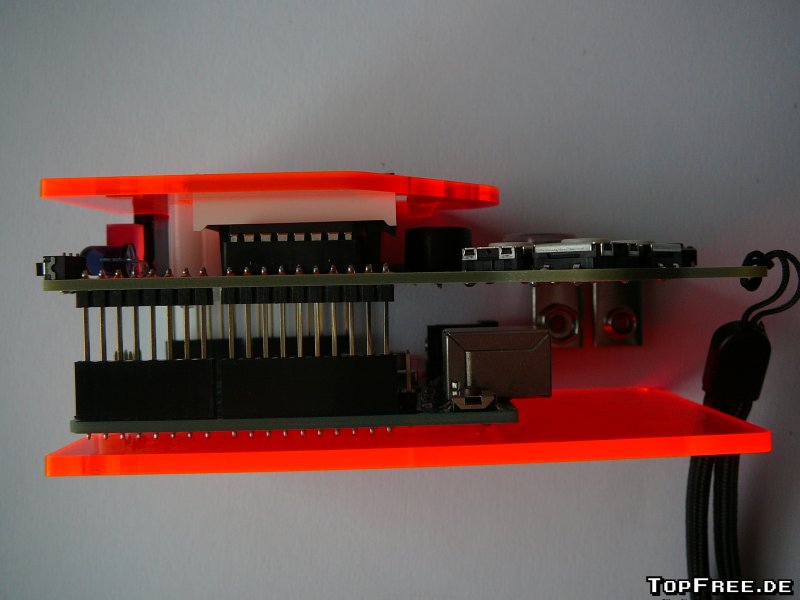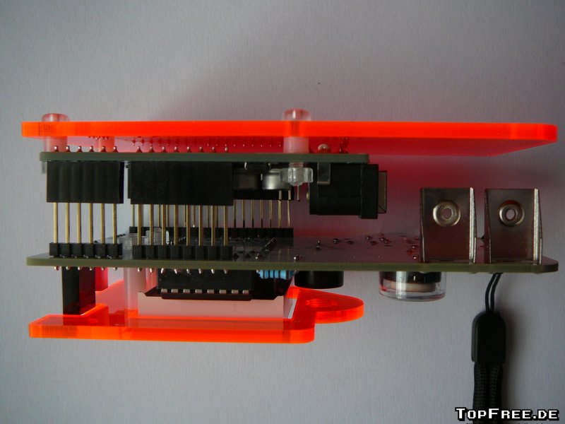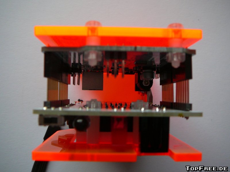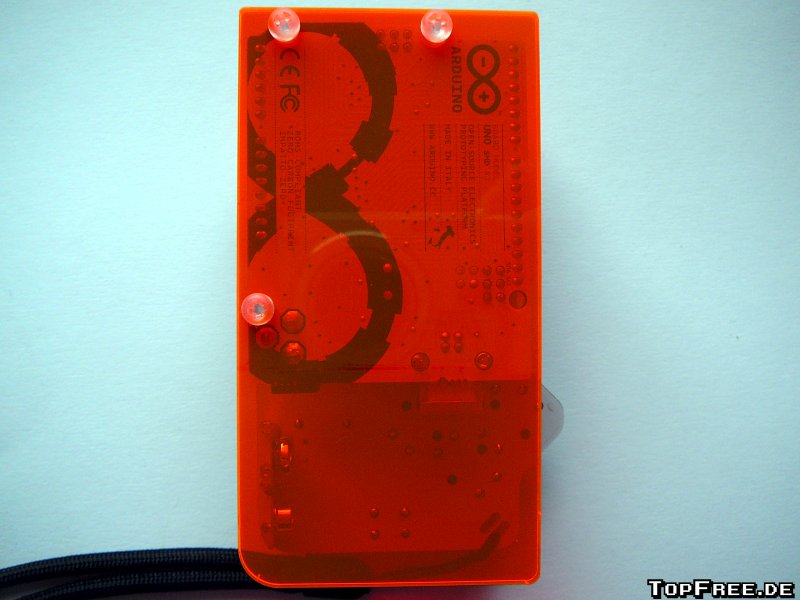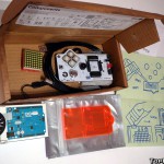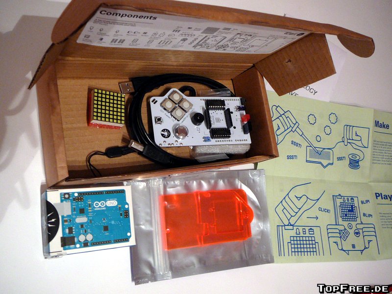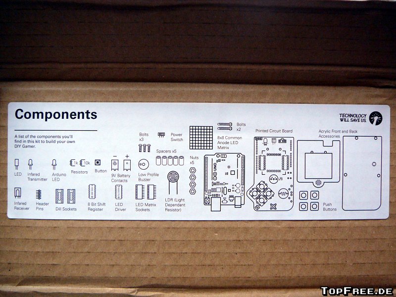 Die recht kleine längliche Verpackung kam unbeschädigt an. Ausgepackt kamen die noch vorhandenen Einzelteile der Pre-Built Variante zum Vorschein. Wer gerne lötet, bekommt es mit insgesamt 40 Einzelteilen zu tun. Jetzt müssen nur noch ein paar Sachen zusammengesteckt und, optional, die Plastikverdeckung per Hand mit den Plastikschrauben befestigt werden. Das 8×8 LED Display wird vorne aufgesteckt, wobei der Schriftzug „Technology Will Save Us“ nach unten zeigt.  Der „kleine Italiener“, Arduino Uno SMD, wird ausgepackt und hinten auf die Steckplätze gesteckt. Danach ist das „Do It Youself“ Gamer Kit funktionstüchtig. Jetzt kann noch die lichtdicht verpackte Plastikabdeckung mit den beigelegten Plastikschrauben und Muttern befestigt werden. Die Röhrchen sorgen dabei für den nötigen Abstand zu den Bauteilen. Ein wenig muss dabei rumgefriemelt werden, gerade bei einer Schraube, für die auf dem Arduino nicht viel Platz ist. Zudem ließ sich bei mir eine Schraube nicht festdrehen, da die Mutter nicht optimal darauf passte. Am Ende abert sitzt alles, wackelt und hat Luft.