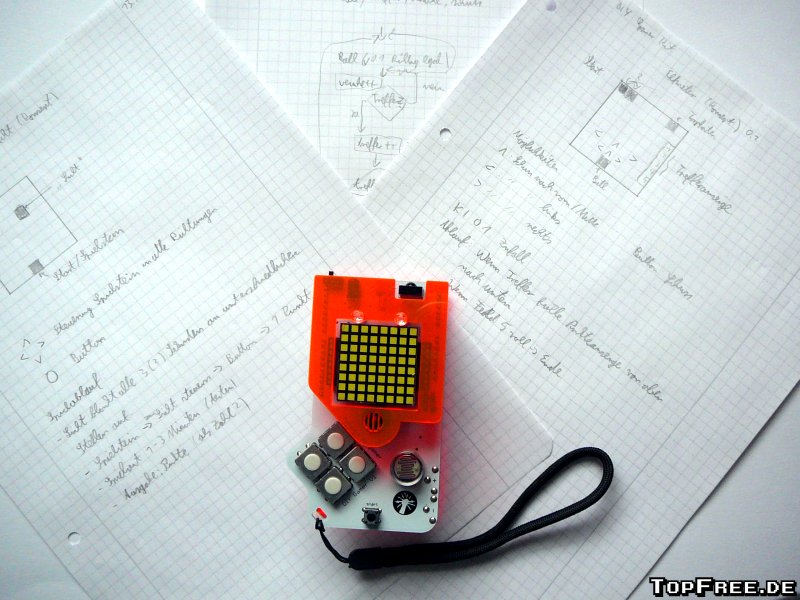 Ersteindruck: „DIY Gamer Kit“ (DIY Gamer V1) ist ein ein schönes Produkt. Wer noch lötet, löten kann oder will, hat wohl noch mehr davon – was mir persönlich dabei fehlt, ist eine Anleitung zum Löten, denn bis auf ein Video gibt es bisher nichts dazu. Die vorgelötete Version (Pre-Built) von „Technology Will Save Us“ aus London wirkt gut verarbeitet und funktioniert, zumindest soweit ich es im Ersteindruck beurteilen kann. Die Snakeversion ist minimalistisch, wie alles, das sich auf einem 8×8 Bildschirm programmieren lässt. Mit C/C++ Kenntnissen lassen sich mit der Arduino Software kleine (maximal 32 KB große) Spiele oder Spielereien programmieren. Infos gibt es unter twsu.co/diygamer. Zwar besitzt der selbstgebaute Handheld „nur“ vier Knöpfe sowie einen Startbutton, hat aber auch einen Lichtsensor (!), Summer und Infrarot-Sender und -Empfänger für Multiplayerspiele. Damit lässt sich wunderbar rumspielen. Mit der beliegenden Schlaufe, kann man den Gamer Kit an die Hose machen sogar ums Handgelenk binden. Da alles offen ist, sollte man schon ein wenig vorsichtig damit umgehen.