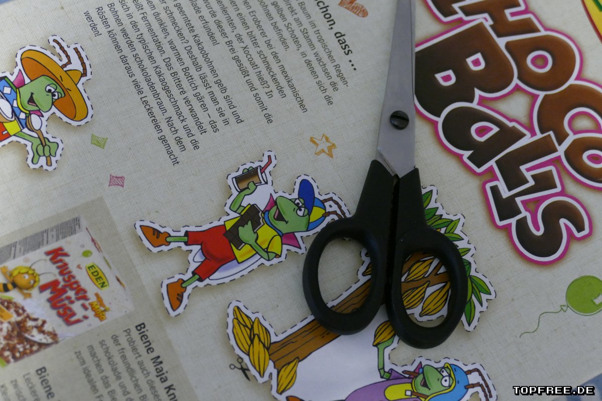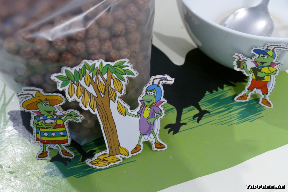 Im Jogurt oder mit Milch oder Mandeldrink schmecken die kleinen Schokobälle – nicht zu süß, dafür knackig. Tatsächlich mag ich den etwas bitteren Geschmack. Den Honig schmeckt man, oder eher ich, jedoch nicht heraus. Zum Basteln gibt es übrigens auf der Rückseite drei grüne Figuren zum Ausschneiden. Es ist wohl immer ein und dasselbe Männchen, das wohl das Maskottchen der Choco Balls ist. Vielleicht der Choco Ball? Oder Manfred? Man weiß es nicht so genau. Der Kostenpunkt liegt zwischen 3 bis 5 Euro für 375 Gramm – meist erwischt man Eden-Produkte im Reformhaus oder gut sortiertem Bio-Sortiment.