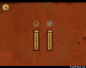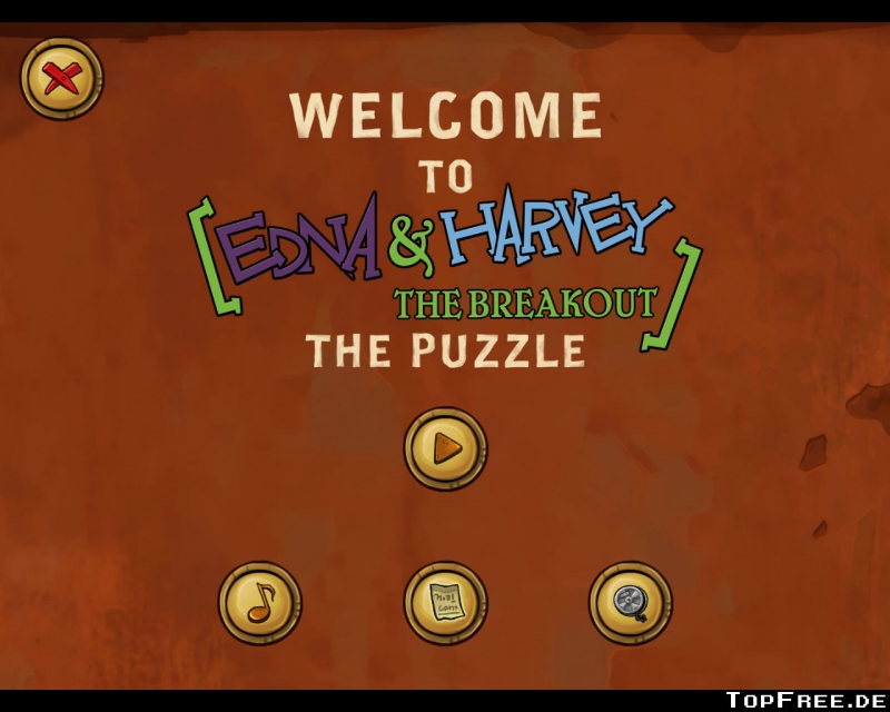 Was aber schon nach dem ersten Spielstart auffällt: Es gibt so gut wie keine wählbaren Optionen. Das Spiel startet zunächst im Fenstermodus (800 x 600) und wechselt dann auf Vollbild. Drückt man irgendwann die Escape-Taste springt der Spielbildschirm wieder in den Fenstermodus. Wie man dann aber wieder in den Vollbildmodus wechseln kann, habe ich nicht herausfinden können. Selbst das Drücken sämtlicher Tasten brachte keinen Sprung ins Vollbild. Demenstprechend kann ich nur empfehlen, den internen Zurück-Knopf links oben im Spiel zu nutzen, möchte man nicht im Fenster spielen. Ansonsten gibt es nur noch vier Knöpfe: Eine Playtaste, einen Notenbutton, einen Zettel und eine Filmrolle. Es lassen sich einzig und allein die Tonstärke und Soundeffekte anpassen. Mehr Einstellungen gibt es in diesem Spiel nicht. Weder kann man die Auflösung ändern noch den Schwierigkeitsgrad auswählen. Was die anderen Knöpfe im Hauptmenü sollen? Hinter dem Zettel verbergen sich die Credits, hinter der Filmrolle sind einzig und allein zwei YouTube-Links zu den Videos von Edna and Harvey: The Breakout und Harvey’s New Eyes Trailer hinterlegt. Das war es.