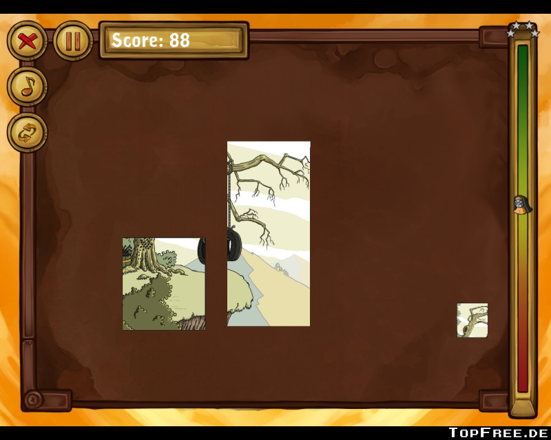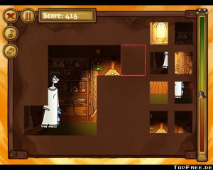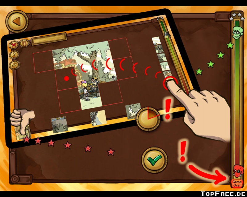 Gespielt wird komplett mit der Maus. Da es keine Anleitung gibt, muss man selbst herausfinden wie das alles funktioniert. Einzig ein kurzer Infoscreen gibt Hinweise auf die Funktion des Spiels. Bei Search & Find werden rechts diverse Puzzleteile aufgelistet, die auf das jeweils automatisch markierte Feld passen sollen. Angeklickt werden soll natürlich das richtige. Je schneller man das passende Puzzleteil gefunden hat, desto mehr Punkte gibt es. Klickt man zu oft den falschen Bildausschnitt an, geht die rechte Leiste langsam aber sicher in Richtung Game Over. Das Motiv kann zudem noch gedreht werden.