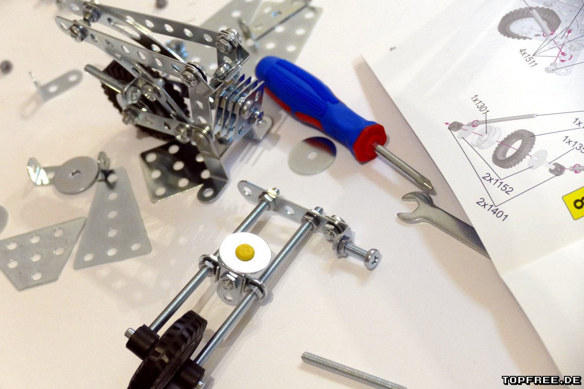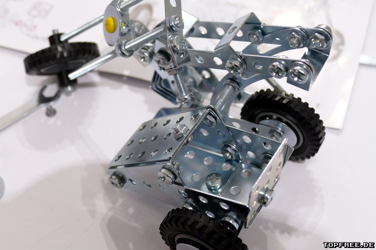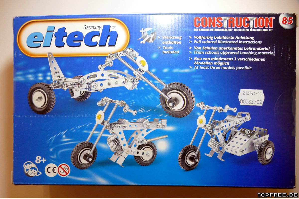 eitech – die Eichsfelder Technik eitech GmbH aus Pfaffschwende stellt Lernspielzeug Made in Germany her. Mit dem Modell Nummer 85 gibt es aus der Serie Construction – Der kreative Metallbaukasten – ein Motorrad mit Beiwagen. TopFree.de hat den metallischen Flitzer mal zusammengebaut