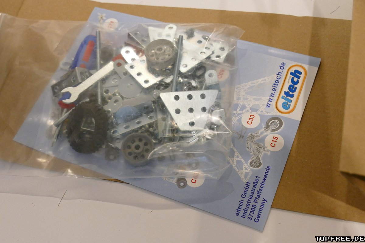 Das Set besteht laut Verpackungsangabe aus 170 Teilen und soll für Kinder ab 8 Jahren geeignet sein. Enthalten ist bereits alles was zum Zusammenbau benötigt wird. Werkzeug, die Metallteile und Räder sowie eine „vollfarbig bebilderte Anleitung“ – wobei es bei einem Metallmodell eher eine graufarbig bebilderte Anleitung heißen sollte. Es ist möglich daraus drei verschiedene Modelle zu bauen, angegeben ist „mindestens“. Falls man kreativ genug ist, kann man vielleicht selbst noch andere Modelle entwerfen, mit Ergänzungssets oder den weiteren Produkten von eitech erweitern. Zudem ist es ein „von Schulen anerkanntes Lehrmaterial“ und soll die Motorik, Kreativität und Lernfähigkeit fördern. Die Firma eitech wurde 1955 von Eberhard Rapp als Metallverarbeitungsunternehmen mit zunächst 35 Mitarbeitern gegründet. Die Metallbaukästen „CONSTRUCION“ wurden 1977 ins Leben gerufen. 2013 kam die 2.4 GHz-Technik bei RC-Modellen zum Einsatz. Zuletzt gab es im Jahr 2016 eine Umstellung der Oberflächenveredelung von Nickel auf Zink bei den Metallbaukästen. Dann schauen wir uns das Ganze doch einmal an …