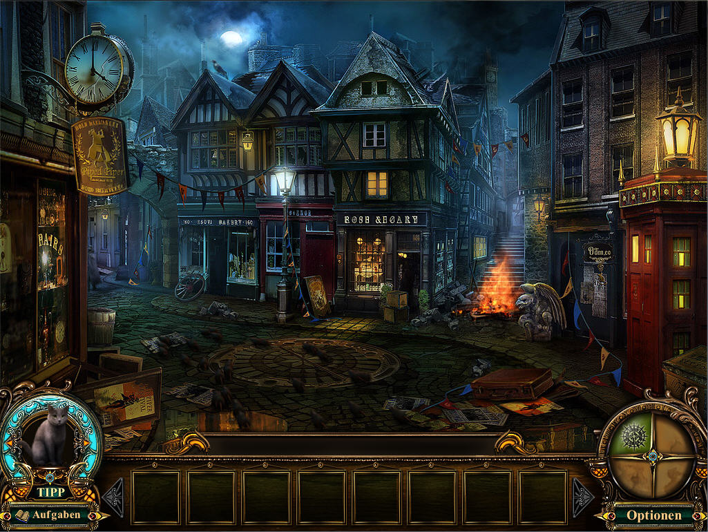 Du bewegst dich in und unter der Stadt Hameln. Den Spuren des Rattenfängers hinterher, um ihn zu stoppen und mit seiner Flöte die Ratten wieder zu vertreiben. Zur Hilfe stehen dem Spieler eine „Katze“ als Tipp-Button zur Verfügung, sowie ein Kompass, ein Rabe, ein Schlüssel und eine Ratte. Diese werden im Laufe des Spiels eingesammelt. Außerdem kann man ein Bonus -Level erspielen und es steht einem ein Handbuch zur Verfügung, aber auch im Netz sind Komplettlösungen zu finden. Die Wimmelbild-Szenen und Rätsel können aber zufällig sein und anders ausfallen, als im Handbuch. Der Schwierigkeitsgrad läßt sich auch im Verlauf des Spiels noch ändern. So hat man die Möglichkeit dieses Wimmelbildspiel individuell durchzuspielen. Ich mags sehr gerne, wenn ich selber nachdenken muss, wie und mit was man eventuell voran kommt.
