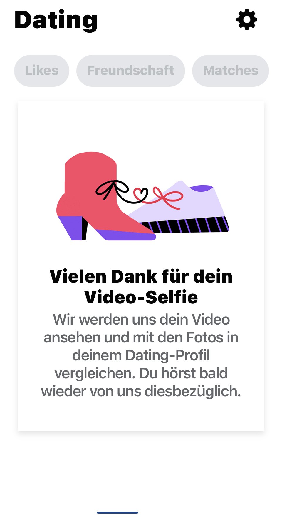 Nachdem du dein Video gesendet hast, gleicht unser Review-Team es mit den Profilfotos deines Dating-Profils ab. Du erhältst ein Update, sobald es bestätigt wurde.