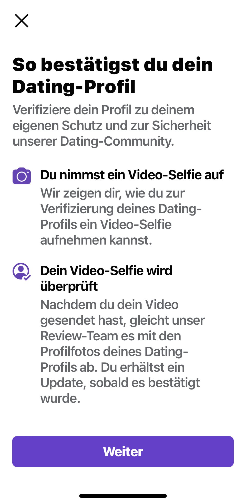 Vielen Dank für dein Video! Damit können wir dein Dating-Profil verifizieren. Außerdem verwenden wir dein Video, um Fehlverhalten wie Nachahmungen und Fake-Profile auf Facebook zu erkennen und vorzubeugen.