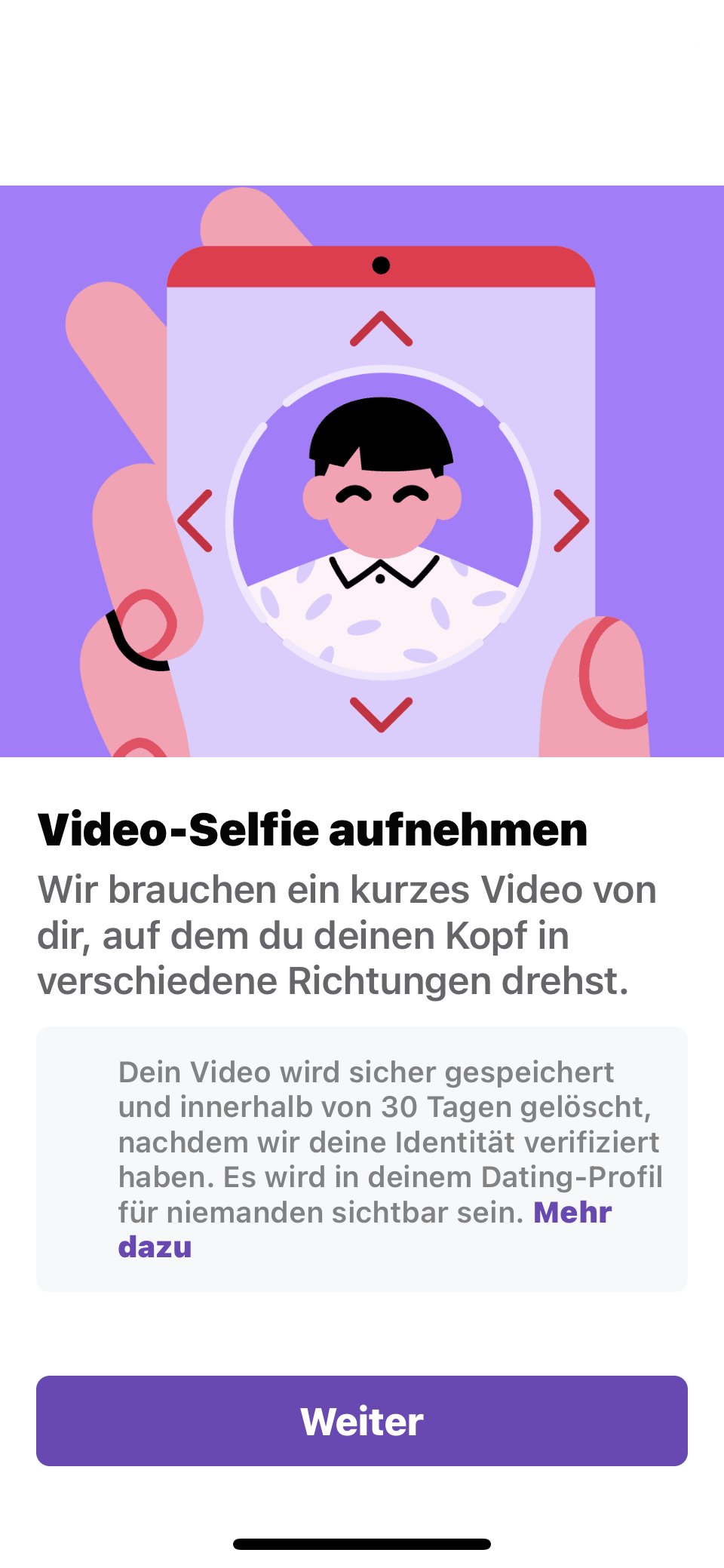 Dein Video wird sicher gespeichert und innerhalb von 30 Tagen gelöscht, nachdem wir deine Identität verifiziert haben. Es wird in deinem Dating-Profil für niemanden sichtbar sein. Mehr dazu