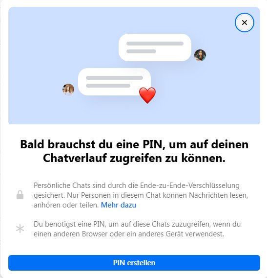 „Bald brauchst du eine PIN, um auf deinen Chatverlauf zugreifen zu können. Persönliche Chats sind durch Ende-zu-Ende-Verschlüsselung gesichert. Nur Personen in diesem Chat können Nachrichten lesen, anhören oder teilen. Du benötigst eine PIN, um auf diese Chats zuzugreifen, wenn du einen anderen Browser oder ein anderes Gerät verwendest.“ – so lautet der Text mit einem blau hinterlegten Button „PIN erstellen“. Aktuell lässt sich das zu Facebook zugehörige Chatprogramm noch mit dem kleinen x rechts oben schließen, aber womöglich schon bald ist dies dann nicht mehr möglich. Dann musst du eine sechsstellige PIN-Nummer vergeben, um überall auf deine Chats (PC, Laptop, Handy) zugreifen können.