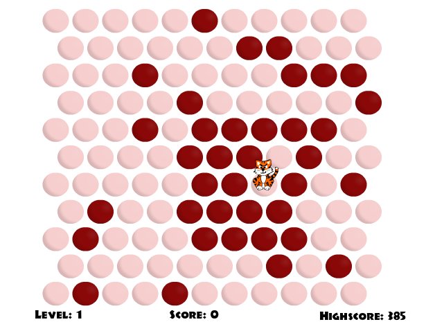 Dazu werden die freuen Flächen auf dem Feld angeklickt. Der Tiger darf nicht an einer der Außenseiten herauslaufen, sondern muss komplett eingekesselt werden. Sobald der Tiger (wie im Bild oben) in der Falle sitzt, hast du gewonenn. Das Ziel ist es natürlich einen möglichst hohen Highscore zu erreichen. Sobald der kleine Tiger nämlich einmal draussen war, geht es wieder von vorne los.
