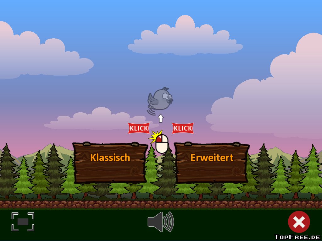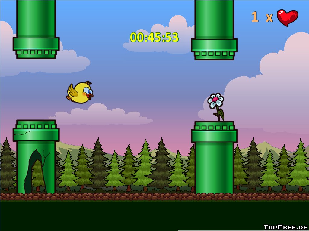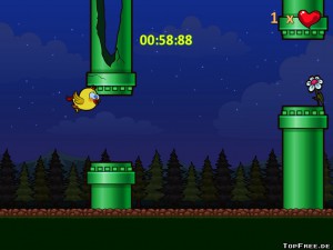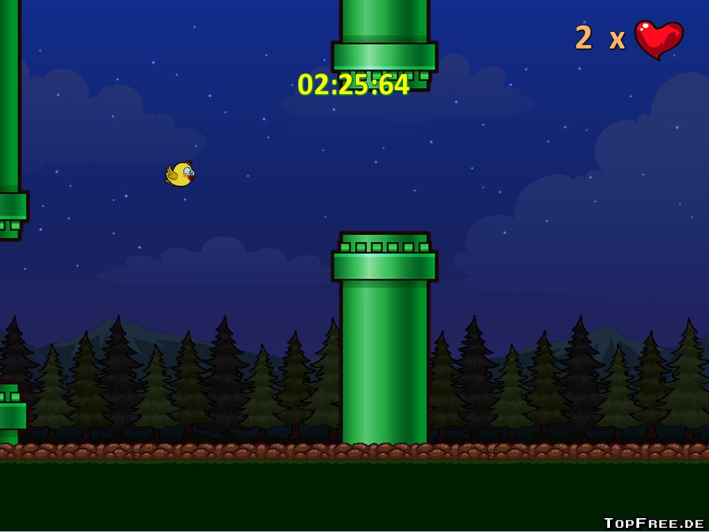 Klassisch wird nach Punkten gespielt. Der Vogel fliegt automatisch nach vorne. Mit einem Klick auf die linke Maustaste bewegt sich dieser ein Stück hoch und darf nichts berühren. Was bei der Original-App vielleicht Spaß macht – keine Ahnung, ich habe diese nie gespielt – ist hier auf jeden Fall total öde. Die ersten zwei Röhren sind noch etwas weiter auseinander, dann werden sie ein Stück enger und bleiben wie sie sind. Der Hintergrund bleibt starr und bis auf den Flügelschlag gibt es keinerlei Animationen. Die einzige Abwechslung bietet der Erweiterten-Modus sowie ein zufälliger Tag-Nacht-Wechsel. Im erweiterten Spielmodus wird einfach nur die Zeit hochgezählt und man hat drei Leben. Dazu gibt es drei Extras, eine Blume, die den dicken Flatterer kleiner macht, ein Superman-Umhang, um die Röhren zu zerstören und einfach hindurchfliegen zu können und Herzen für neue Leben. Denn stößt man an eine Röhre oder berührt den Himmel oder Boden verliert man im erweiterten Modus ein Leben. Ob man bei Tag oder Nacht spielt ist reiner Zufall. Nach jedem Spielstart wird neu gewürfelt. Auch hier: Das war’s!