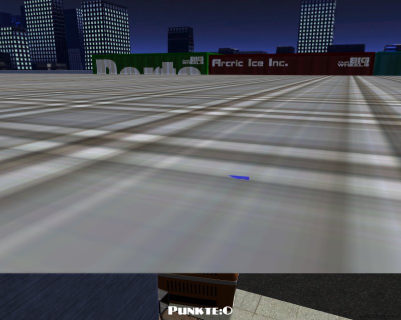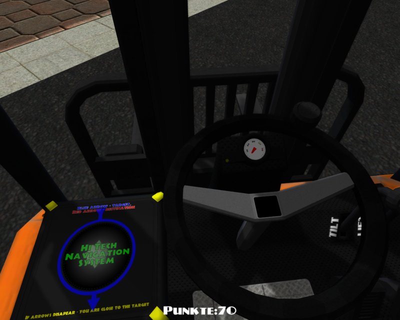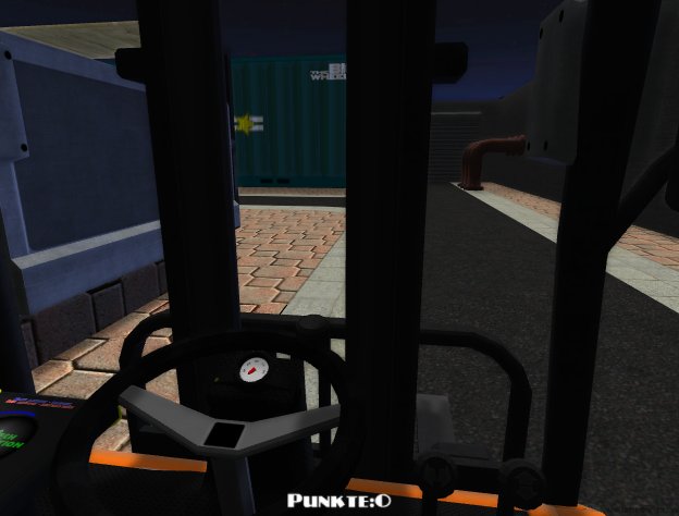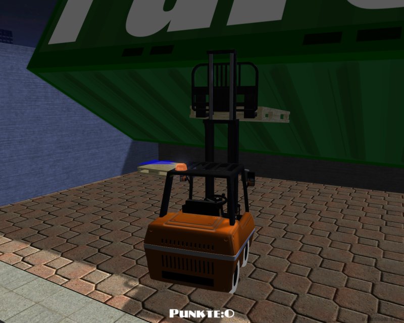 Schon jetzt fühle ich mich rund 15 Jahre zurückversetzt. Auf geeeehts! Die Innensichtkamera ist total unübersichtlich (die armen Gabelstaplerfahrer). Naja, es gibt ja noch vier andere. Taste 2 gedrückt, nix ändert sich, denn damit bin ich wohl gestartet. Also geht es auf die 1 – die Außensichtkamera. Schon besser, aber irgendwie von der Seite. Taste 3 ist quasi wie 2, nur ein Stückchen weiter vorne. Taste 4? Taste 5? Nix! In der Außenansicht kann die Perspektive mit der rechten gedrückten Maustaste geändert werden, ebenfalls auch bei den anderen Perspektiven. Ziemlich mühselig und unkomfortabel. Gesteuert wird mit den Pfeiltasten oder wahlweise WASD. Der ganze Gabelstapler sieht irgendwie ziemlich komisch aus. Zumindest ist der Stapler mit einem „Hi Tech Na Vigation System“ ausgestattet. Die ersten Fahrversuche bringen einen schon zum Lachen, denn fährt man zu schnell um die Kurve, kippt das Dingen um und…hüpft automatisch wieder auf die Beine! Ja, wirklich, es springt hoch und stellt sich wieder hin (Video)! Wie realistisch! Manchmal schmettert es einen auch alle Räder ab, die dann in eigenartiger Physik durch die Gegend hoppeln.