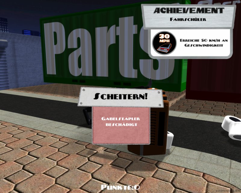 Innerhalb der Missionen soll man jetzt Paletten und Co. von A nach B transportieren und erhält dafür Punkte. Dazu gibt es noch ein paar Achievements, wie z.B. schnell fahren. Wer das Achievment „Du bist ein Star“, das man bei einer Spielzeit von 24 Stunden erhält, bekommt von mir einen Orden!