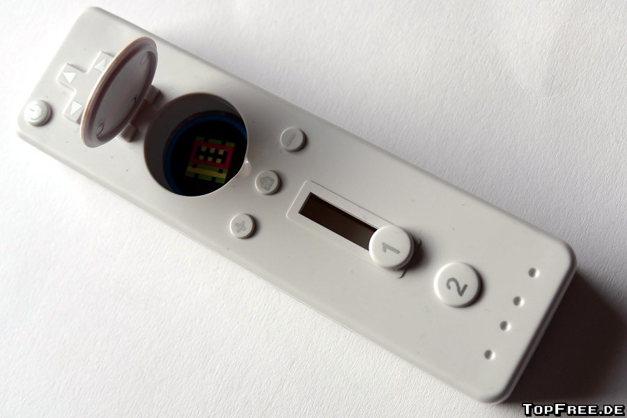 Angelehnt an das Design eines Wii Remote Controllers liegen dem Controller Shooter sechs passende Discs mit 8-Bit-Motiven bei. An dem Controller befindet sich eine Klappe, in die man die Discs – auch alle auf einmal – einlegen kann. Schiebt man jetzt den Knopf „1“ nach vorne, schießt eine Disc vorne heraus. Vielleicht bin ich aber auch einfach zu alt dafür. Wirklich interessant ist aber, dass die Discs auch als Einkaufschip genutzt werden können! Die Größe ist nämlich perfekt passend – habe ich vor dem Artikel noch schnell ausprobiert. Mit den aufgeklebten Retro-Motiven sieht das sogar nicht mal schlecht aus im Portmonaie. Also, hat das Plastik-Spielzeug ja doch noch einen Sinn …