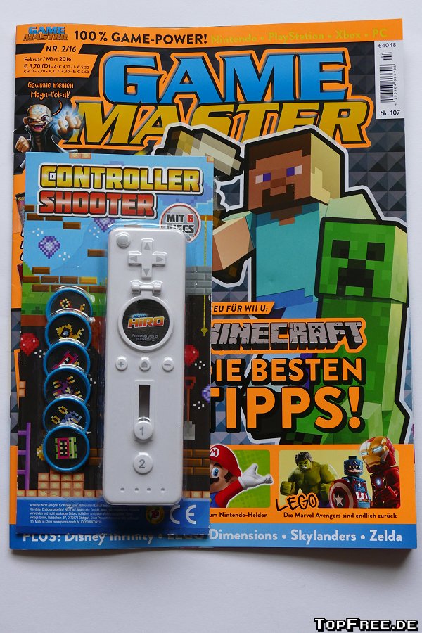 Die neueste Ausgabe von Game Master erschien gestern, am 17. Februar 2016. Als Gimmick liegt ein „Überraschungsextra“ bei. Entweder Skyzos Booster, Space Warrior Car, Disney Infinity Bonus Münzen, 2x Kid Icarus Booster, Gormiti Waps, Controller Shooter oder Rocket Blaster. Bei meinem Zeitschriftenhändler gab es nur Magazine mit dem Controller Shooter. Ein von Panini gerne eingesetztes Gimmick beim Game Master. Denn die Shooter mit den dazugehörigen Discs gab es schon öfter. Interessanter dürften da die DS-Boxen und DS-Spiele-Boxen sein. Manchmal gibt es auch Aufkleber für den DS oder auch mal einen DS als Wasserpistole. Finger-Skateboards waren ebenfalls schon einmal dabei. Ob man’s braucht? Den Shooter auf jeden Fall nicht wirklich. Immerhin kann man den kompletten TÜV-Bericht auf einer eigens eingerichteten Seite von Panini von den Gimmicks mittels einem 11-stelligen Code einsehen.