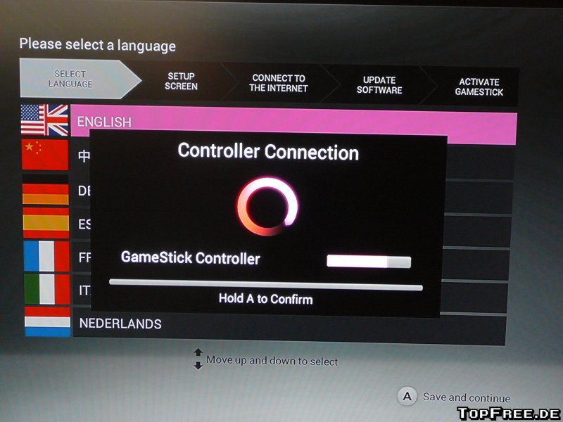 Als aller erstes muss der Controller synchronisiert werden. Dies kann allerdings mehrere Anläufe dauern, bis dieser endlich vom Stick gefunden wurde. Die Power-Taste wird für drei Sekunden gedrückt gehalten, danach sollte nur noch eine Lampe blinken. Sobald auf dem Bildschirm das Signal gegeben wird, muss die A-Taste gedrückt gehalten werden. Danach sollte das Gamepad erfolgreich synchronisiert sein und kann auch ohne Kabel, via Bluetooth, verwendet werden. Sollte der Controller auch nach mehreren Suchdurchläufen nicht erkannt werden, trennt einmal die Stromquelle vom Stick. Als letzte Lösung bleibt dann noch die Reset-Taste auf der unteren Seite des Controllers, die allerdings nur mit einem dünnen Gegenstand erreicht werden kann (z.B. Zahnstocker, nicht zu spitz…).