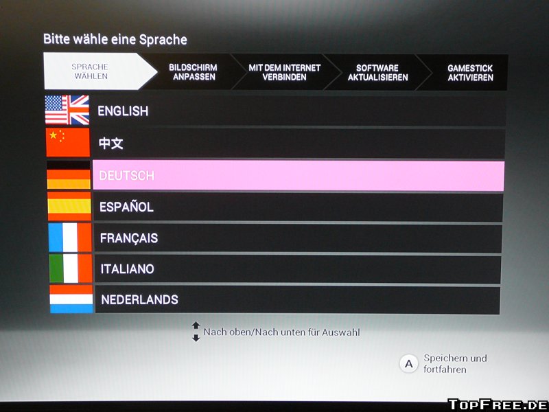 Gut ist, es steht auch die deutsche Sprachauswahl zur Verfügung. Wer sich verdrückt und auf Chinesisch landet, kann mit der B-Taste wieder einen Schritt zurück.