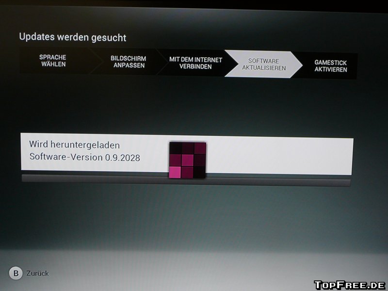 Leider kann der Schritt der Software-Aktualisierung nicht übersprungen werden. Gerade, wenn man nur den GameStick einrichten möchte, um die Video-Einstellungen zu ändern, ist dies sehr unkomfortabel. Trotz einer angezeigten Signalstärke von 75% dauerte der Download bis zur Hälfte gut 1 1/2 Stunden. Puh! …danach tat sich gar nichts mehr. Woran lag es? Der Stick scheint eine ziemlich schlechte Wi-Fi-Schnittstelle zu besitzen. Es ist auf jeden Fall ratsam, seinen Fernseher so nahe wie möglich am Router (oder umgekehrt) zu platzieren. Der Download konnte nämlich erst erfolgreich beendet werden, als das Fernsehgerät mit Stick direkt neben dem Router platziert wurde. Danach dauerte der Download keine 15 Minuten mehr – die Hälfte war ja bereits geschafft.