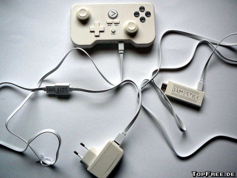 Zunächst einmal muss der GameStick aus dem Gamecontroller genommen werden. Dazu wird auf der Rückseite der Schiebeknopf nach oben gedrückt und der Stick kommt zum Vorschein. Praktisch verpackt und so sehr gut zum Mitnehmen geeignet. Was etwas stört sind jedoch, zumindest zum Mitnehmen, die Kabel. Denn der GameStick benötigt auf alle Fälle eine Stromquelle. Zunächst war es geplant, via MHL, Strom aus dem Fernseher beziehen zu können. Dies wurde allerdings, relativ still, gecancelt, mit der Begründung, dass über MHL 1.0 nur wenig Strom bezogen werden kann und MHL 2.0 noch nicht sehr verbreitet ist. Somit muss der Stick mittels Micro-USB Schnittstelle und dem beigefügtem Kabel mit Strom versorgt werden. Entweder über die USB-Schnittstelle vom PC oder Laptop oder mit dem, ebenfalls mitgeliefertem, Netzteil. Wer den GameStick importiert bzw. aus dem Ausland bestellt, sollte darauf achten, dass in Nicht-EU-Ländern ein US-Stecker mitgeliefert wird. Dann ist ein Adapter für die hiesige Steckdose vonnöten.
