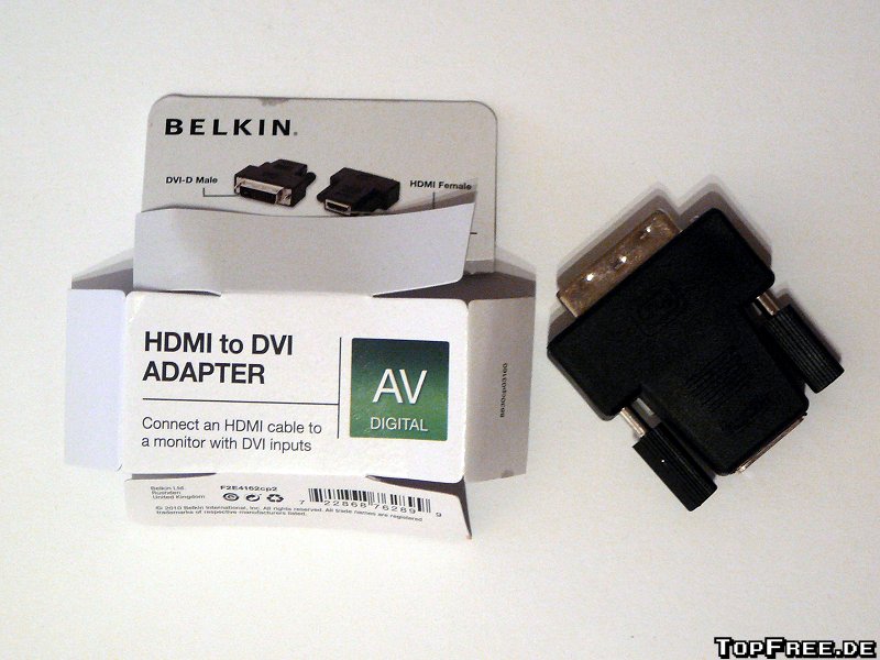 Was braucht man? HDMI -> DVI Adapter. Meinen habe ich vom Hersteller Belkin für acht Euro im Saturn gekauft. Auf Amazon gibt es diesen ebenfalls für wenige Euro. Andere Adapter sollten ebenso problemlos funktionieren, denn der Adapter leitet das Signal, im Gegensatz zu einem Konverter, einfach weiter, ohne es in irgendeiner Form umzuwandeln.