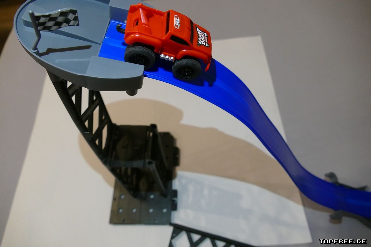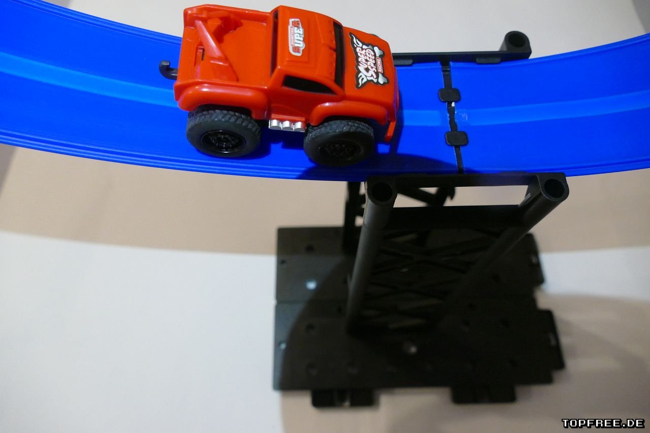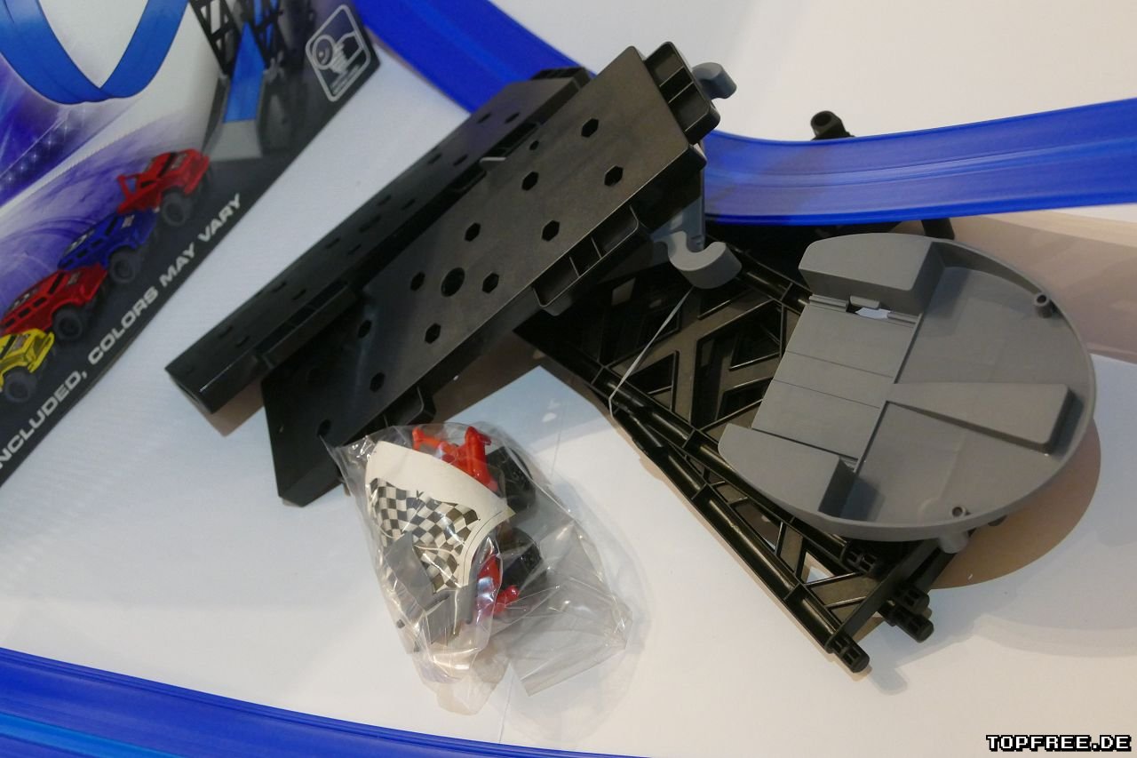 Die Aufbauanleitung ist auf der Rückseite der recht großen Verpackung (36×27,5×7,5 cm) aufgedruckt. Es müssen lediglich ein paar Teile zusammengesteckt werden, was recht schnell gelingt. Für die Zielrampe ganz oben liegen noch zwei Fahnen mit vier Aufklebern bei. Beim Auto sind die Aufkleber bereits aufgeklebt, jedoch recht schief.