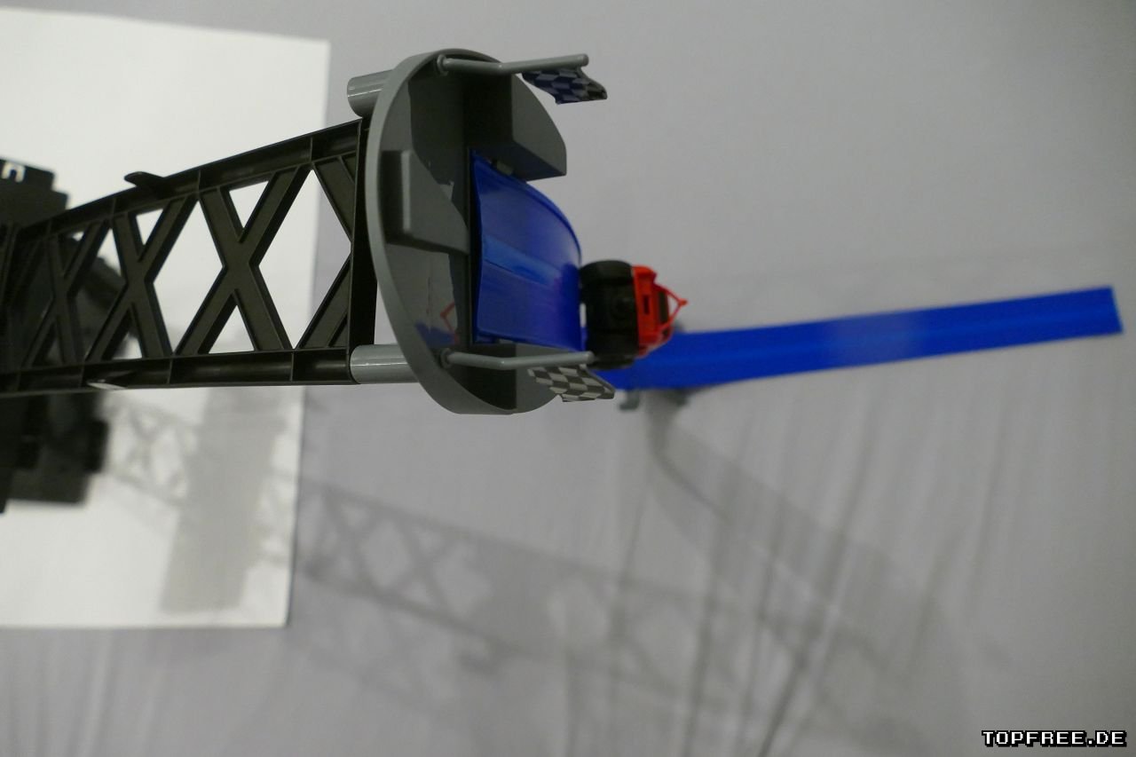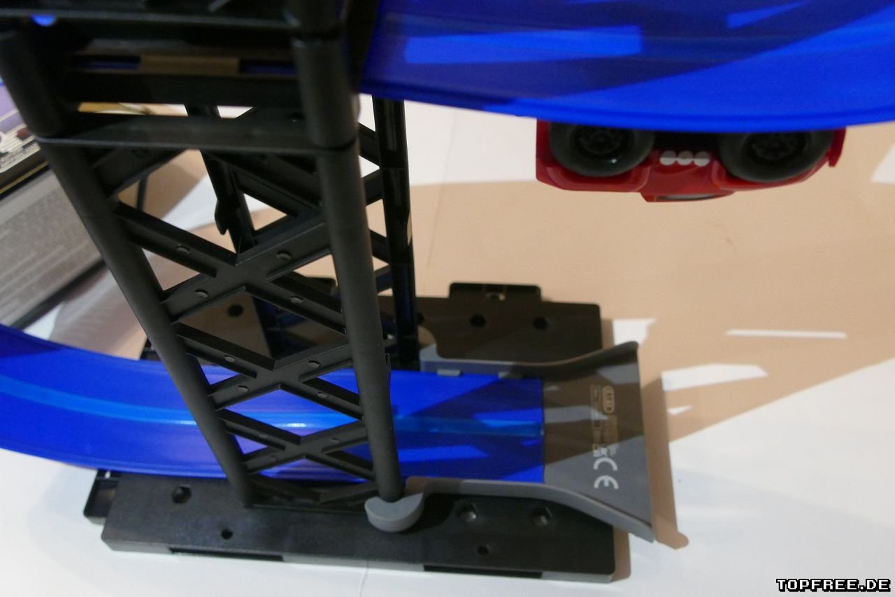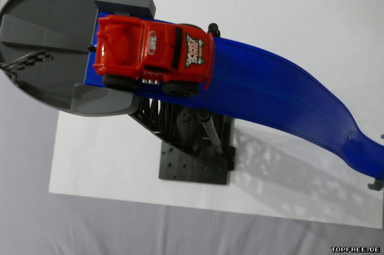 Die Aufbauanleitung ist auf der Rückseite der recht großen Verpackung (36×27,5×7,5 cm) aufgedruckt. Es müssen lediglich ein paar Teile zusammengesteckt werden, was recht schnell gelingt. Für die Zielrampe ganz oben liegen noch zwei Fahnen mit vier Aufklebern bei. Beim Auto sind die Aufkleber bereits aufgeklebt, jedoch recht schief.