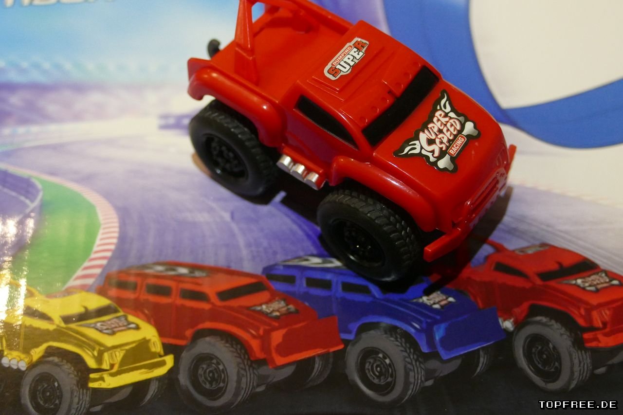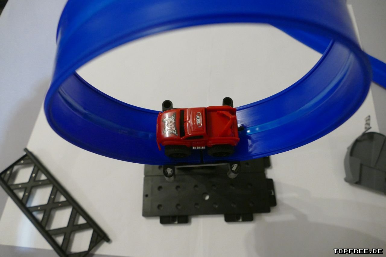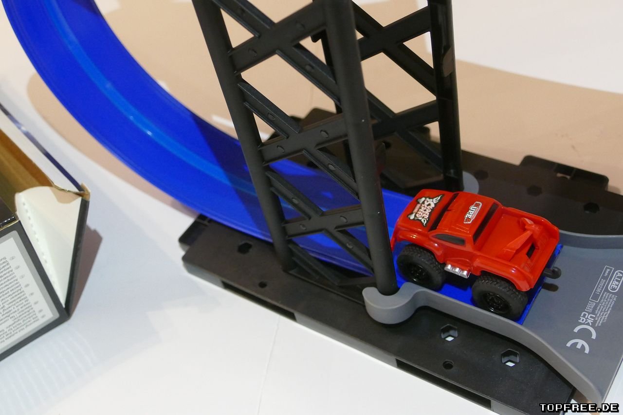 Dabei gibt es mehrere Varianten dieser Autorennbahn. Nicht im KODi, wo ich es gekauft habe, dort gab es nur diese Variante. Und nur im Laden vor Ort, nicht online. Aber auch diese vertikale Rennbahn gibt es noch in einer Nummer größer, quasi noch einmal mehr um die Kurve nach oben. Ebenso scheint es eine Variante nur mit einem in sich geschlossenen Looping zu geben. Mit dabei ist immer ein Auto, zufällig ausgewählt aus einer von vier Varianten. Dieses kann man sich also nicht aussuchen.