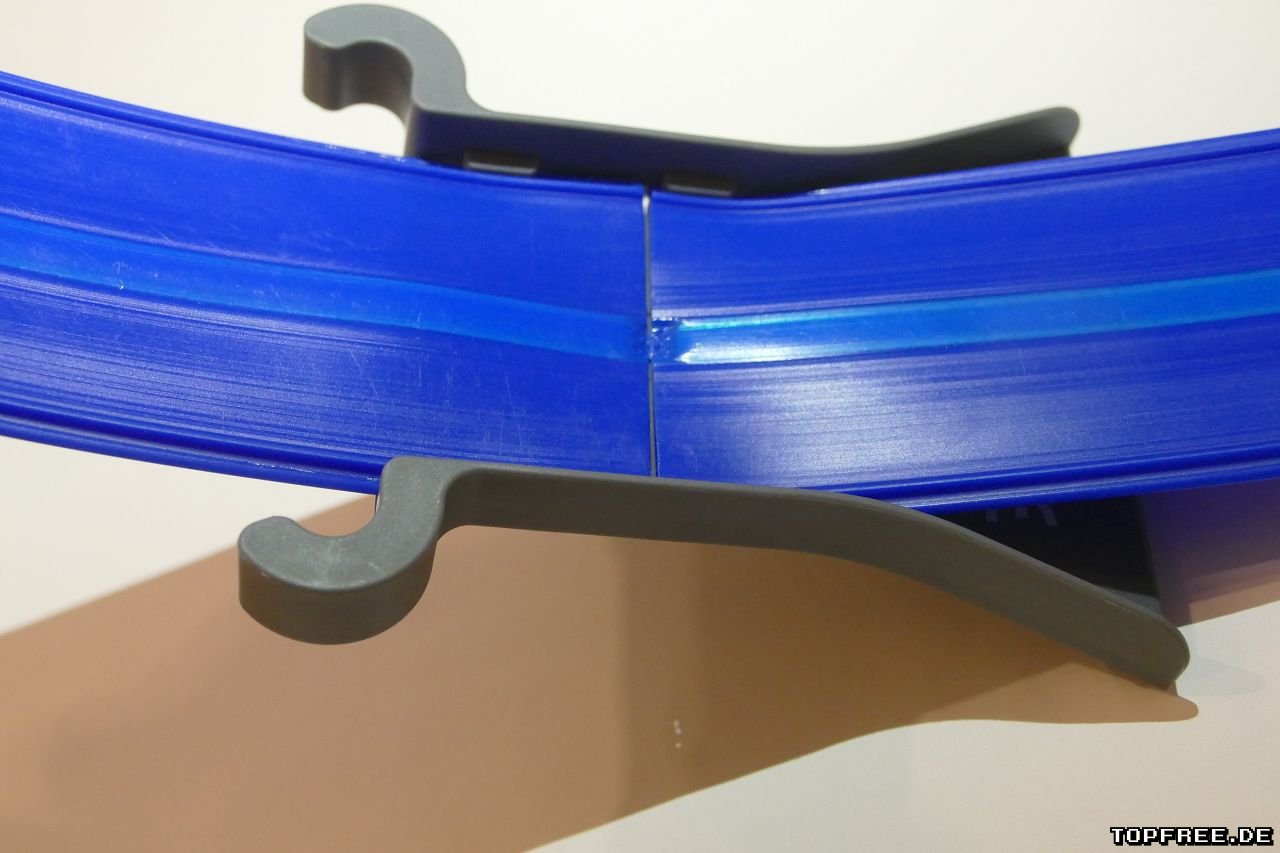Das mitgelieferte Rennauto, bei mir ein roter Pickup, ist ein Spielzeugauto zum Anschieben. Also diese Autos, die man mehrmals auf dem Boden nach vorne bewegt und dadurch immer schneller werden. Unter dem Auto befinden sich zwei kleine Magnete unter der Plastikkarosserie. Die blaue Rennbahn ist mit einem Magnetstreifen in der Mitte beschichtet. Dabei ist es beim Aufbau übrigens egal wie herum man die Bahnteile aufbaut, beide Seiten sind gleich.