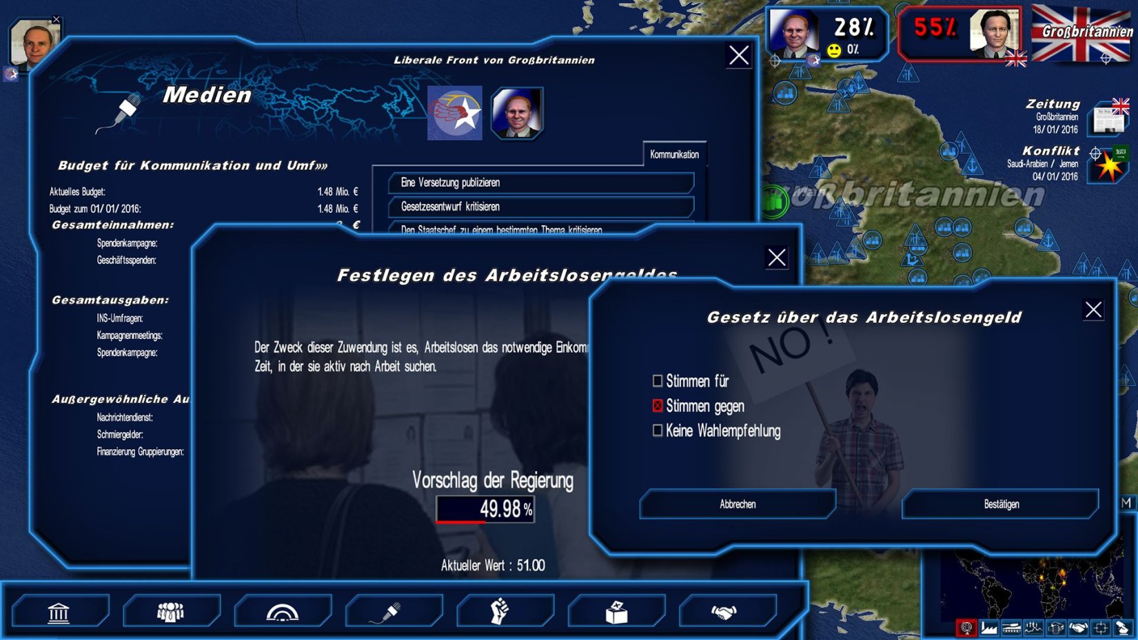 In dieser geopolitischen Simulation unserer aktuellen Welt schlüpfen die Spieler in die Rolle eines politischen Anführers (Staatschef, Präsident, König, Premierminister, Parteivorsitzender, Anführer einer illegalen Gruppierung) eines oder mehrerer Länder, die sie zu Beginn des Spiels auswählen. Sie können anschließend in verschiedenen Bereichen wirken: Wirtschaft, Soziales, Militär, Innen- und Außenpolitik, Umwelt, Kultur, Transportwesen usw. Alle Länder der Welt sind mit entsprechenden Variablen und eigenen Funktionen vertreten. Das Spiel ermöglicht Hunderte Verwaltungsaktionen im Bereich Wirtschaft, Handel, Militärstrategie, Bauwesen, Spionage, politischer Simulation und Manipulation.