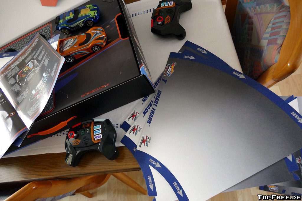 Ausgepackt und aufgebaut werden musste noch die Bahn an sich. Insgesamt können aus den 20 Streckenteilen 40 verschiedene Rennkurse gebaut werden (PDF-Datei mit Vorlagen). Hinzu kommen zwei Controller und zwei Rennautos, bei denen man in Zukunft die Karosserie austauschen kann. Mein Oberdeck war bei einem Auto bereits nicht richtig eingerastet, sodass das Auto den freien Blick auf den „Motor“ gab. Sobald alles im richtigen Schlitz ist, sitzt jedoch alles feste. Im Gegensatz zu billigem Plastikspielzeug, machen die Rennwagen von Mattel und die Controller auf den ersten Blick einen stabilen Eindruck. Der Controller in Form eines Gamepads hat insgesamt zwölf Buttons und einen Joystick. Als gewohnter Gamepad-Spieler liegt dieser recht gut in der Hand und alle Buttons sind gut erreichbar. Für die Fahrt selbst wird der für einen Controller recht ungewöhnliche Gashebel im hinteren Teil, mit dem Zeige- oder Mittelfinger, benutzt. Auf der linken Seite befindet sich noch ein „Gefahrenauslöser“. Die gewohnten L- und R-Knöpfe sind hier ein Bestätigungs- und Beenden- / Zurück-Knopf. Ansonsten befindet sich vorne ein Joystick zum Lenken nach links und rechts, ein kleiner Einstellungsbutton, die Powertaste und die Buttons für Automatischer Fahrmodus, Schwierigkeitslevel, Freispielmodus, Übungsmodus und Meisterschaftsmodus. Sieht auf den ersten Blick recht verwirrend aus, wird aber bereits nach wenigen Minuten zur Routine.