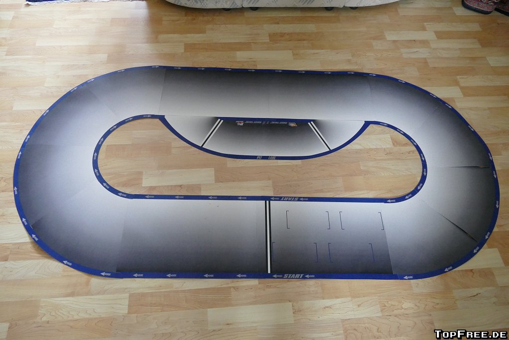 Der Aufbau der Streckenteile geschieht durch ein Zusammenschieben in dafür vorgesehene Laschen. Die einzelnen Teile sind mit Buchstaben beschriftet. Natürlich muss man nicht die dafür vorgesehene Vorlagen nutzen (siehe oben), sondern kann auch seine eigenen Strecken zusammensetzen. Die einzelnen Teile bestehen aus einer Art dickeren Pappe. Tatsächlich erwies es sich als etwas friemelig, die Laschen in die dafür vorgesehenen Schlitze zu stecken. Meine erste Befürchtung war, dass die Laschen mal einreißen. Denn umgeknickt sind sie bereits einmal, jedoch ohne Schaden – puh! Irgendwann hat man den Dreh raus und alles geht schneller von der Hand. Zudem erweist sich das Material im ersten Eindruck doch als recht zäh. Eine kurze Rundstrecke mit zwölf Streckenteilen (Layout 1) und zwei für die Boxengasse ist dann schnell aufgebaut.