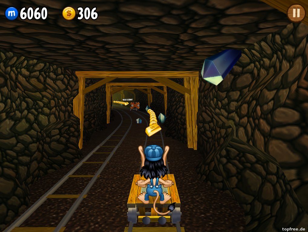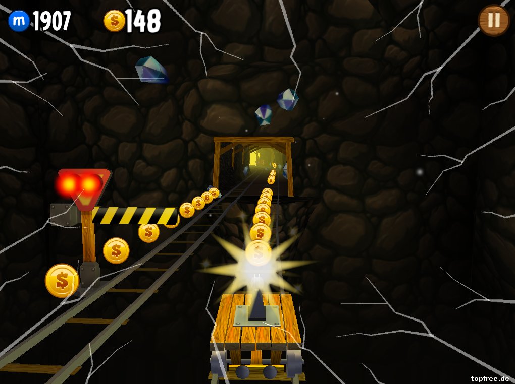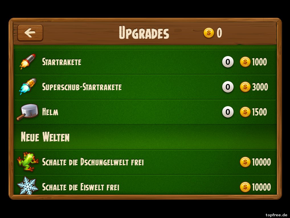 Im Hauptmenü stehen die Punkte „Spielen“, „Upgrade“, „Trolley-Werkstatt“ und „Einstellungen“ zur Auswahl. Am unteren rechten Bildschirmrand gibt es zudem noch zwei Buttons für die eigene Statistik und die Credits bzw. Mitwirkenden. In den Einstellungen kann nur die Musik- und Sound-Lautstärke reguliert sowie das Tutorial an und ausgestellt werden. Mehr gibt es hier nicht. Auch das Spiel komplett zurückzusetzen, ist nicht möglich. Bei den Upgrades stehen diesmal neben den Powerups auch neue Welten zur Auswahl, die gegen genügend eingesammlten Goldmünzen freigeschaltet werden können. In der Werkstatt können neue Fahrgestelle, natürlich ebenfalls gegen Goldmünzen, erworben werden. Ein Klick auf „Spielen“ lässt das Spiel, bzw. beim ersten Start das Tutorial, sofort starten. Eine Auswahl an verschiedenen Leveln oder Welten gibt es nicht, denn diese können ausschließlich während des Spiels durch das Befahren der verschiedenen Höhlen bespielt werden (sofern vorhanden).