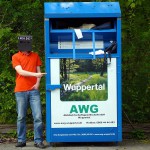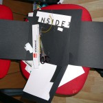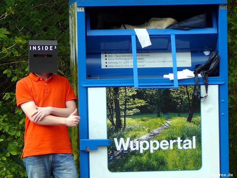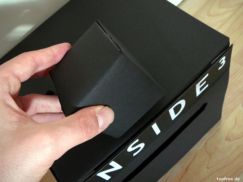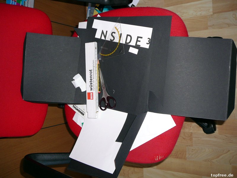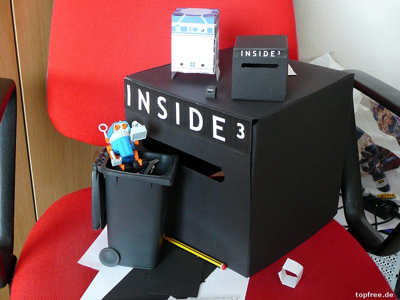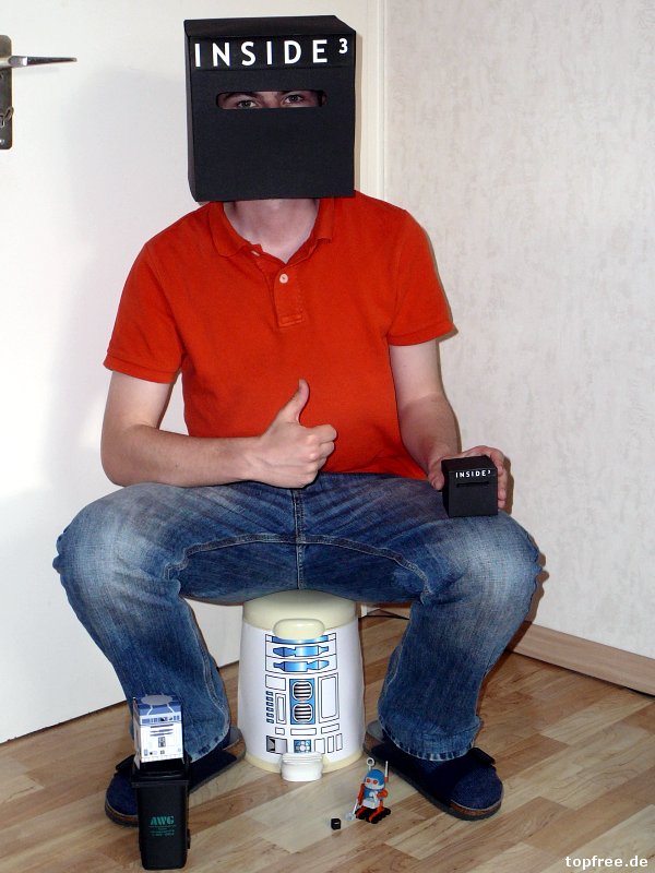 Gut, dass Isa mich angeschrieben hatte, um mir die Infos für den Fotowettbewerb mitzuteilen. Denn aus dem Kauderwelsch der Onlineübersetzung wurde ich überhaupt nicht schlau. So wenig schlau, wie bei allen anderen Rätseln davor. Allerdings weckte die Information dann sofort mein Interesse. Es geht um R2D2, Mülleimer und einem selbst. Sprich man soll ein Foto von sich und einem Mülleimer machen, der R2D2 darstellt. Das alleine reichte mir aber nicht. Die erste Idee wurde dann direkt umgesetzt. Die Vorlage lieferte mir ebenfalls INIDE³, nämlich das T-Shirt. „Head in cube“. Kopf im Würfel. Das war’s! Zack, die alte schwarze Pappe aus dem Schrank geholt und losgebastelt. Allerdings reichte mir das immer noch nicht. So entstanden am Ende drei RZwoDZwos und drei INSIDE³-Würfel in den Größen „Head in cube“ (21 cm), „original“ (6cm … wen wunderts: 6x6x6cm!) und „mini“ (1 cm). Ich muss gestehen, dass ich sonst nicht sonderlich viel bastel, aber mit dem Endergebnis, dem Wettbewerbsfoto, bzw. es sind zwei geworden, ganz zufrieden bin.