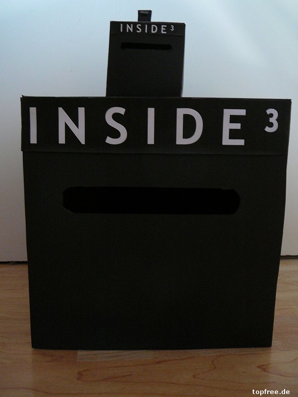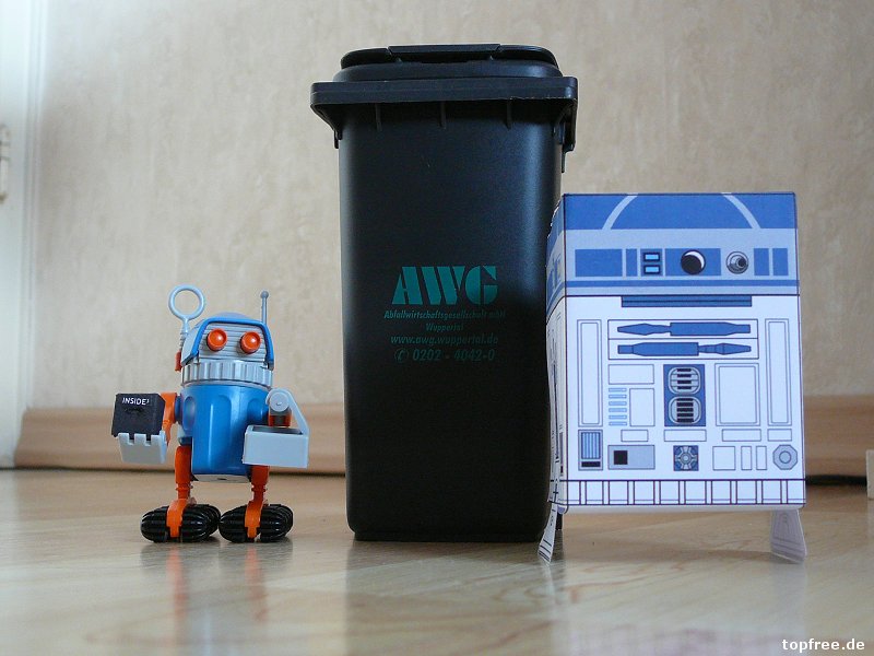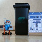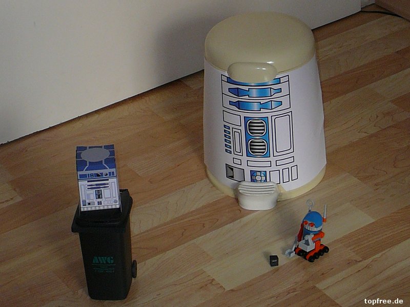 Behind the Scenes: Für Interessierte und Bastelfreunde ein paar weitere Informationen: Zum Erstellen der schwarzen INSIDE³-Würfel wurde eine große schwarze, stabile Pappe verwendet. Der „Head-In-Cube“ ist natürlich unten offen. Für den Halt wurden an den verschiedenen Seiten, nach einer kleinen selbsterstellten Papiervorlage, mit Laschen zusammengeklebt. Die Schlitze wurden mit einem Bastelmesser ausgeschnitten. Den R2D2 in Würfelgröße gibt es unter cubeecraft.com/cubee/r2-d2 zum Selberbasteln. Einfach ausdrucken und zusammenstecken, hier ist kein Kleber notwendig. Allerdings sollte das Papier zum Drucken etwas stabiler sein als normales. Für den Mülleimer wurde als Vorlage diese hier verwendet. Der orange-blaue R2D2 ist eine echte Rarität und vollständig nur noch selten zu finden (Infos).