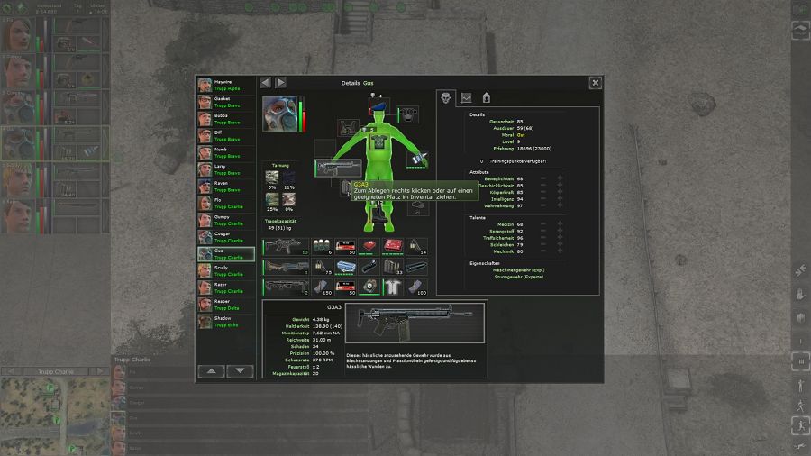 - 50 Söldner, die miteinander interagieren und über einzigartige Fähigkeiten, Schwächen und schräge Persönlichkeiten verfügen