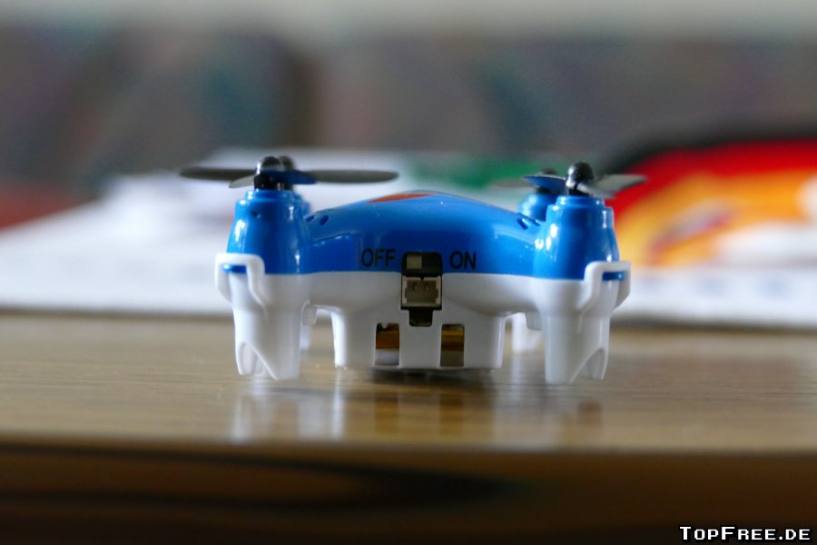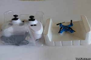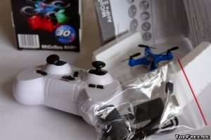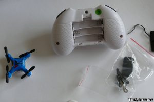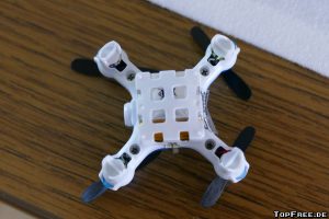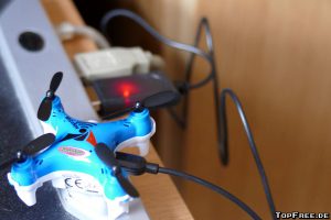 Eine deutsche Anleitung wird natürlich auch mitgeliefert. Hier findet man unter anderem Informationen zur Kalibrierung des Quadrocopters. Es gibt mehrere Einstellungs-Modi von dem einfachen Modus bis hin zur manuellen, schnelleren Steuerung. Eine automatische Trimmung ist ebenfalls vorhanden sowie eine manuelle über die Tasten der Fernbedienung. Dort befindet sich auch eine Aufnahme- (Fix-Focus-Objektiv mit 75°-Aufnahmewinkel und 30 FPS) und Foto-Taste mit 0,3 MP (640 x 480px). Die Fernbedienung liegt gut in der Hand und die Mini-Drohne lässt sich damit ebenfalls gut steuern. Links gibt man „Gas“, rechts wird die Richtung geändert. Da ich Anfänger in Sachen Drohnen bin, brauchte ich erst einmal etwas Übung. Kurioserweise flog meine Drohne zunächst nicht nach oben, sondern immer nach vorne. Durch LEDs wird die Richtung angezeigt, ebenfalls gibt es eine Unterspannungswarnung.