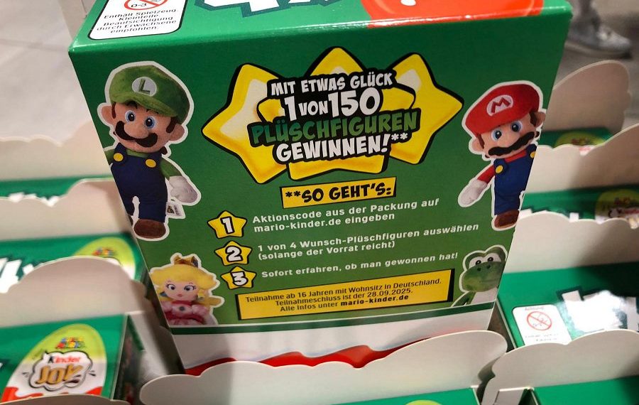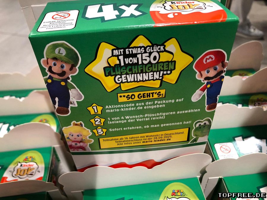 In den aktuellen Kinder Joys gibt es eine von 30 Überraschungen aus der Welt von Super Mario. Neben Figuren wie Mario, Luigi, Prinzessin Peach und Yoshi, gibt es Gadgets wie Stiftdeko, Textmarker und Pop Its (Silikon-Spielzeug). Zudem besteht die Möglichkeit bei einem Gewinnspiel eine von vier Plüschfiguren zu gewinnen:
