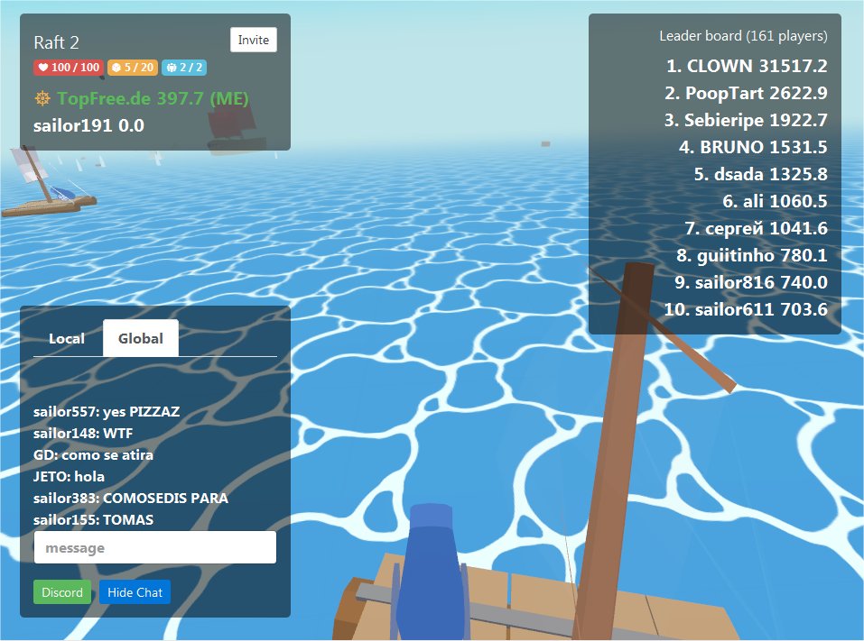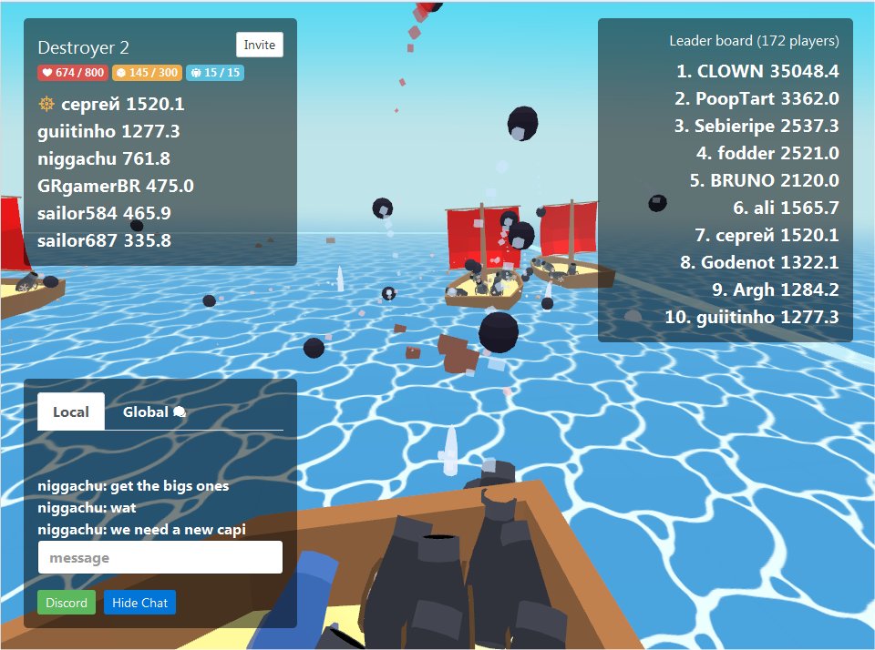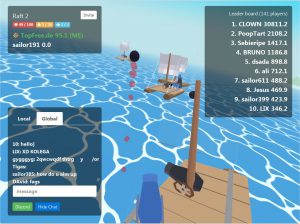 Das Ziel ist es jetzt so viele wie mögliche Treffer zu erzielen, indem andere Schiffe und Flöße getroffen werden. Denn das gibt Punkte. Wer auf dem Boot die meisten Punkte hat, wird zum Kapitän und ist blau. Also, seine Geschütz-Farbe ist komplett blau und nicht mehr grau. Der Kapitän kann gleichzeitig das Schiff besser steuern. Kommuniziert wird per Chat. Entweder Schiffs-Intern oder ihr macht Ansagen an alle Kanonen da draussen auf der blauen Unendlichkeit. Leider wird meist nur grober Unfug gechattet.