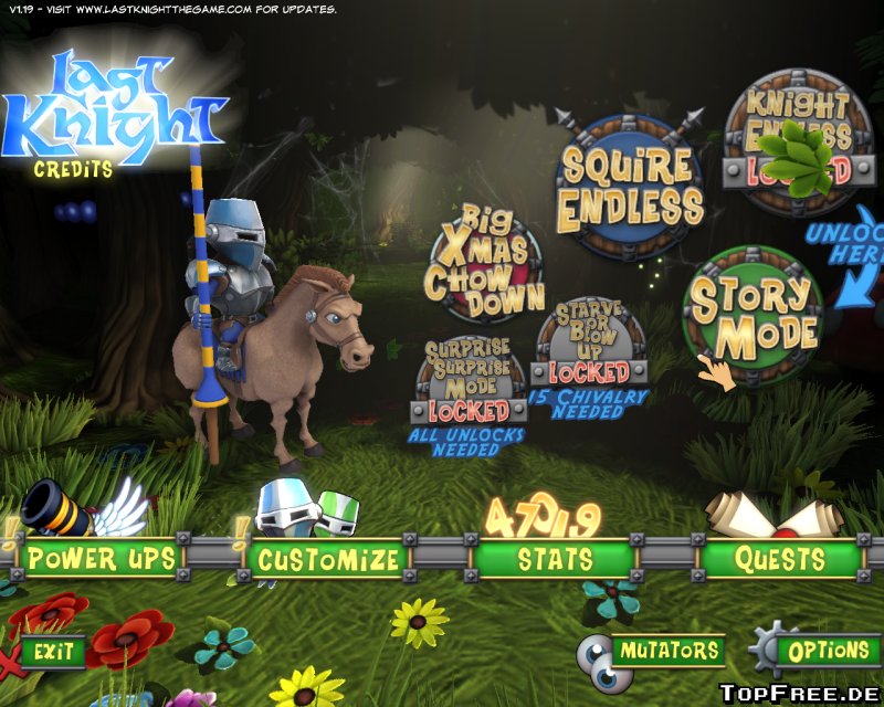 Grafisch kann sich das Indiespiel ebenfalls sehen lassen. 3D-Level mit schönen 3D-Animationen. Dazu wird das Spiel immer wieder weiterentwickelt und es werden neue Effekte eingebaut. Zuletzt wurden die Stürze des Pferdes und Reiters realistischer animiert sowie der zu Weihnachten kurzzeitig eigenständig erhältliche Big Xmas Chow Down eingefügt. Als ich das Spiel kaufte, lag noch die Version 1.18 vor. Mittlerweile gibt es die 1.191, die u.a. einen unschönen Bug behob, bei dem man das Level „Into the dark“ nicht beenden konnte.