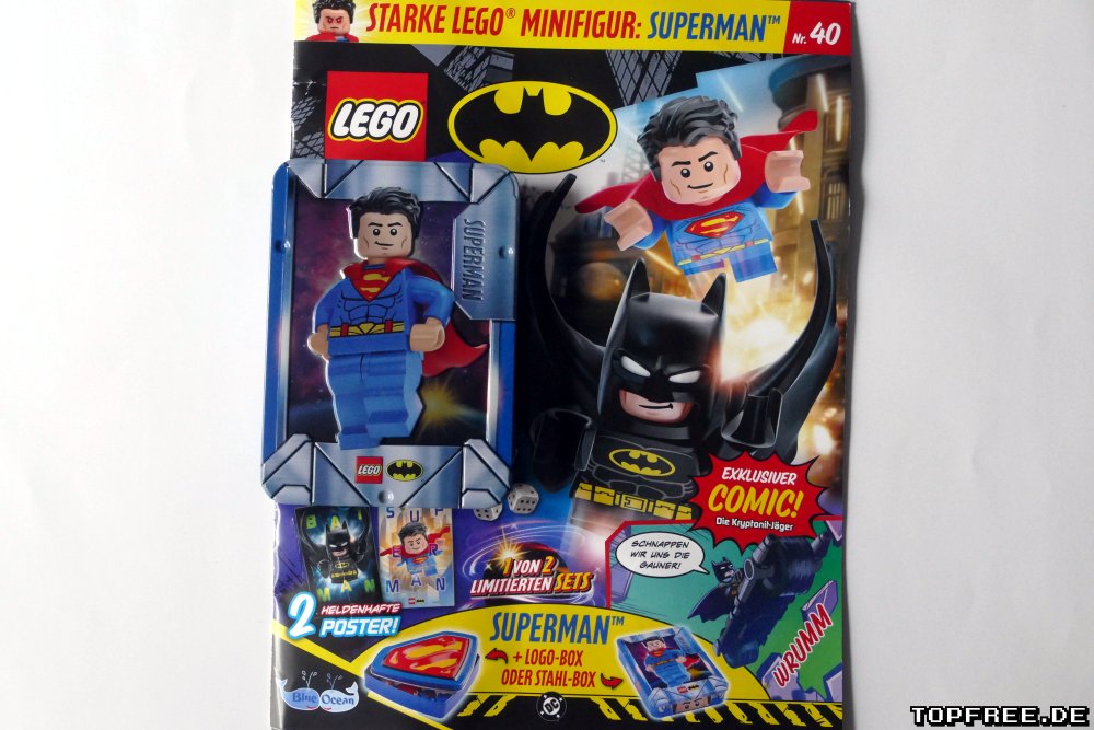 Eine Legofigur von Superman in einem Batman-Magazin. Klingt komisch, ist aber so. Heute laut ZZol (Zeitungen und Zeitschriften online) erschienen, aber die neueste Ausgabe ist eigentlich die Nummer 43. In meinem Zeitschriftladen des Vertrauens lag das Heft, sowohl mit der Logo-Box als auch der Stahl-Schiebebox noch im Regal. Da man Dose Nummer eins, also die mit dem Logo, nicht aufstellen kann, habe ich mich mal fürs Schieben entschieden. Puh, 7,99 Euro sind ganz schön kostspielig!