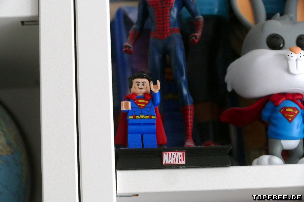 Die Figur, das Extra, befindet sich eben in einer der Stahldosen und besteht aus nur fünf Teilen. Haare, doppelseitiger Kopf, Mantel (starr), Oberteil und Beine. Der Kopf lässt sich drehen und hat entweder einen verschmitzten Blick oder guckt böse drein. Hinten wird das jeweils andere Gesicht dann von den Haaren komplett verdeckt. Auf Seite 14, der Anleitung, ist zudem noch der der kryptonische Superhund Krypto abgedruckt. Schade, dass dieser nicht dabei ist. Alleine wirkt die Figur in der großen Dose etwas verloren. Wohl wirklich (nur) eine Dose zum Sammeln.