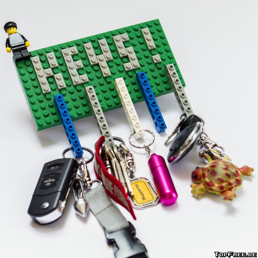 Wie wäre es mal mit einem coolen, aber simplen Schlüsselhalter aus Lego? Im Prinzip benötigt ihr nur sechs passende Legosteine und ihr habt einen richtig coolen Halter für eure Schlüssel. Zusätzlich sieht ein Schlüsselbund mit Legostein ebenso klasse aus. Schlüsselhalter plus Schlüsselanänger in einem! Eine kleine, aber feine Spielerei, nicht nur für Lego-Fans.