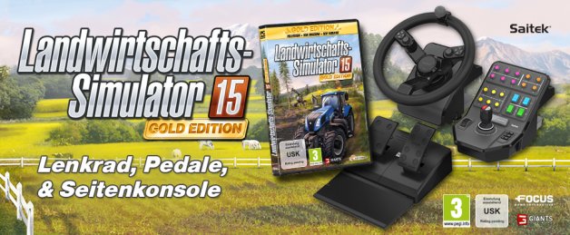 Das Bundle aus Saitek® Landwirtschafts-Simulator-Lenkrad- und Pedal-Set, Seitenkonsole und der Landwirtschafts-Simulator 15 Gold Edition kann in Deutschland ab sofort für 249,99 Euro (UVP) exklusiv über den Online-Versandhändler Amazon vorbestellt werden: http://www.amazon.de/dp/B00ZIUB4A2.