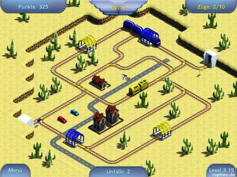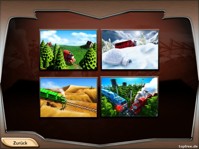 Mit einem Klick auf „Start“ kann zwischen vier verschiedenen Welten, wovon eine von Beginn an zur Verfügung steht, mit jeweils 15 Leveln, gewählt werden. Alle Level werden nach erfolgreichem Abschließen des vorherigen nach und nach freigeschaltet. Der Schwierigkeitsgrad steigert sich immer mal wieder. Zudem gibt es drei verschiedene Arten von Loks, die normale, eher langsame, Dampflok, die etwas schnellere modernere Lok und die futuristische, schnelle, E-Lok.