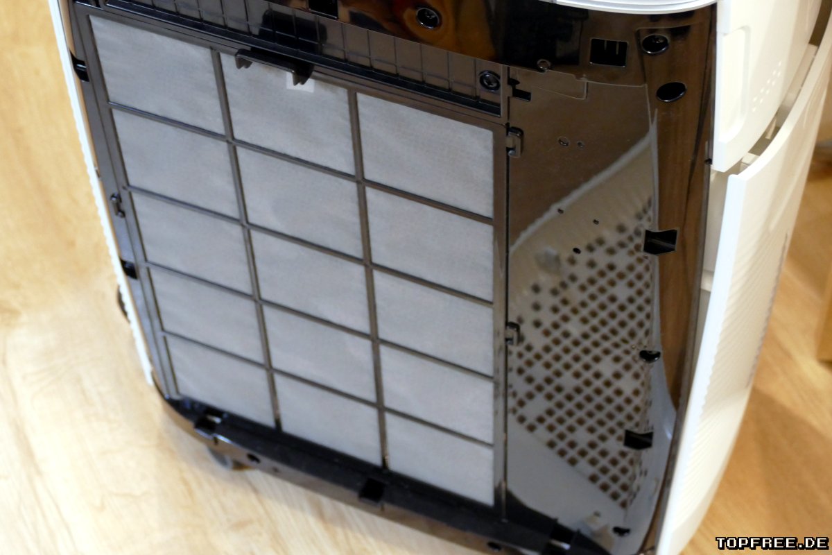 Der Filter besteht aus einem HEPA- und Geruchsfilter, hier einem sogenannten Deodorfilter – Achtung: Kein Aktivkohlefilter – sowie einem Vorfilter. Offiziell heißt es: „Ein hochwirksames, mehrstufiges Reinigungssystem filtert zuverlässig Schadstoffe und Verunreinigungen aus der Luft: Staub, Feinstaub (PM10, PM2.5 und kleiner), Pollen und andere luftgetragene Allergene sowie Krankheitserreger wie Bakterien und Schimmelsporen, Zigarettenrauch, Abgase und Gerüche.“ Für die Luftbefeuchtung gibt es zudem eine extra Verdunster-Kassette.