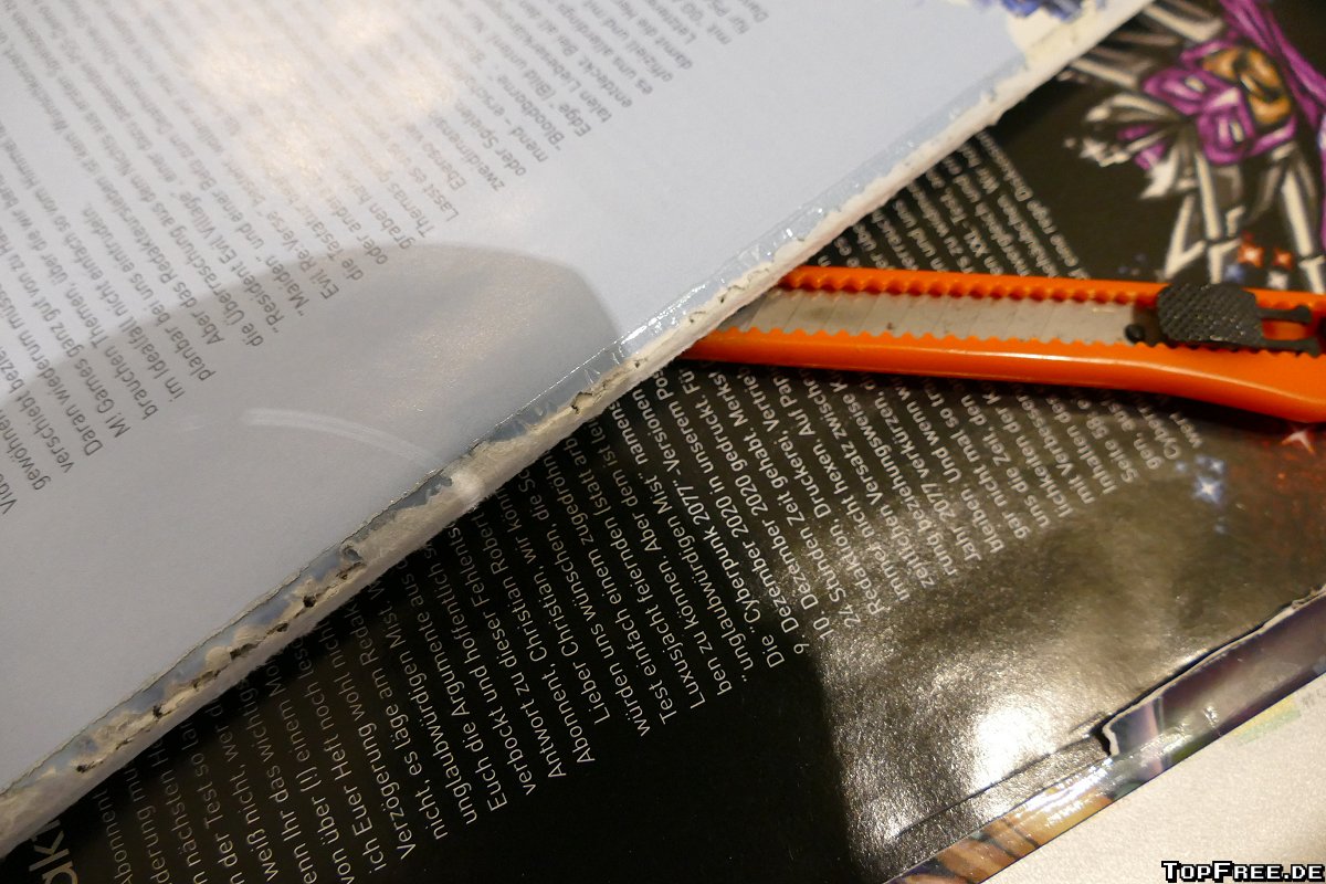 Nicht optimal gestaltet sich die Möglichkeit die Vorderseite direkt mit einem Kuttermesser auszuschneiden (Bild oben schwarz). Das Heraustrennen vorab ist aber umso einfacher (Bild oben hell).