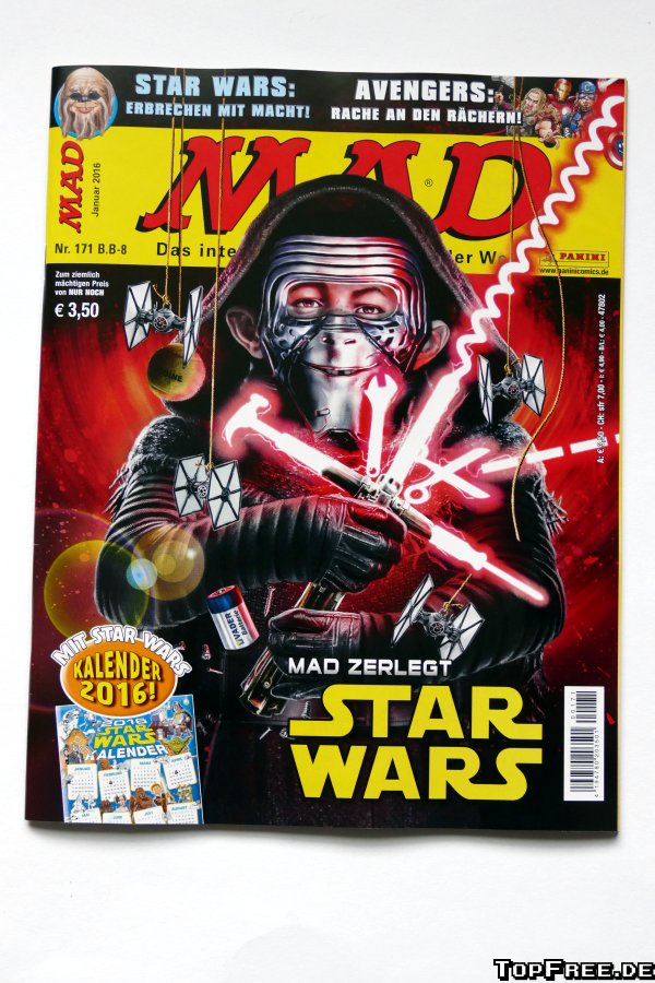 Die aktuelle Ausgabe von MAD steht ganz im Zeichen von Start Wars. Warum wohl!? Kann ich gar nicht nachvollziehen! Zudem ist noch ein Star Wars Kalender 2016 im Innenteil mit allen Erscheinungsterminen des MAD Heftes für das kommende Jahr. Leider fehlt schon wieder das Beste: MAD mobil. Für die nächste Ausgabe 172 ist das Highlight von Ivica Astalos zwar schon wieder angekündigt, aber so langsam werde ich skeptisch, ob es dann endlich mal wieder abgedruckt ist. Schade! Dafür ist Who’s perfect? von Martin Zak wieder mit Zahl drin: Zum vierunddreissigsten Mal!