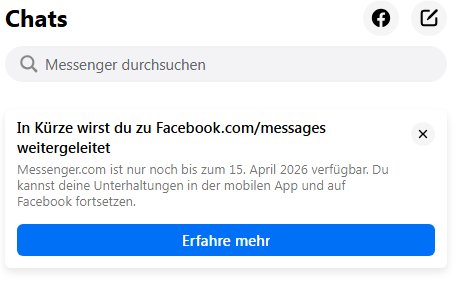 Aktuell erscheint die Meldung, wenn man den Chat von Meta einzeln im Browser verwendet: „In Kürze wirst du zu Facebook.com/messages weitergeleitet“. Und weiter heißt es: „Messenger.com ist nur noch bis zum 15. April 2026 verfügbar. Du kannst deine Unterhaltungen in der mobilen App und auf Facebook fortsetzten.“